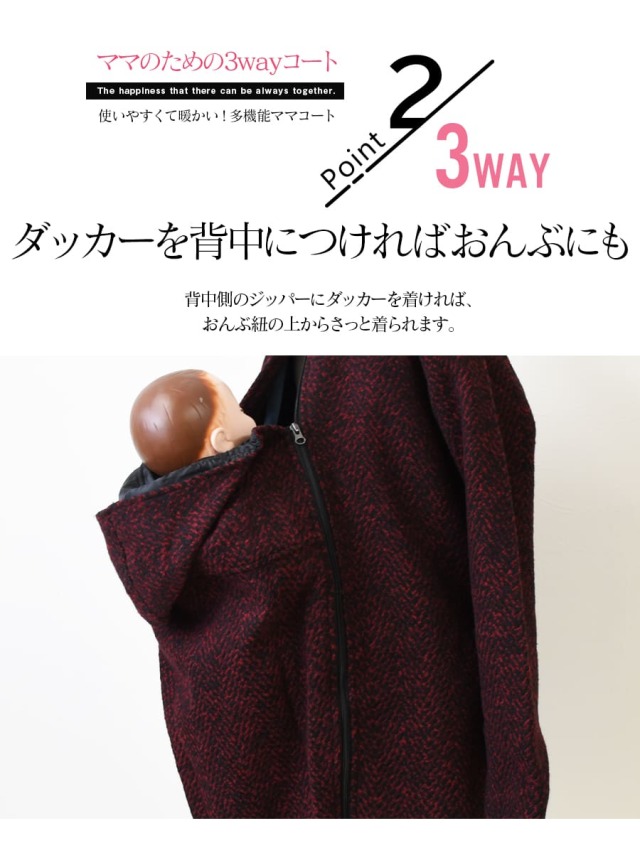 しっかりとした上質なウール素材を使った、暖かくて機能性抜群3WAYで使えるママコート。 「前抱っこ」「おんぶ」も自由自在。 付属のダッカーを使えばママが嬉しい3通りの使い方で、赤ちゃんとの冬をしっかりサポートしてくれます。 エレガントでレディライクなデザインコートは、抱っこ期が終わってもその先までご愛用いただける一着です。