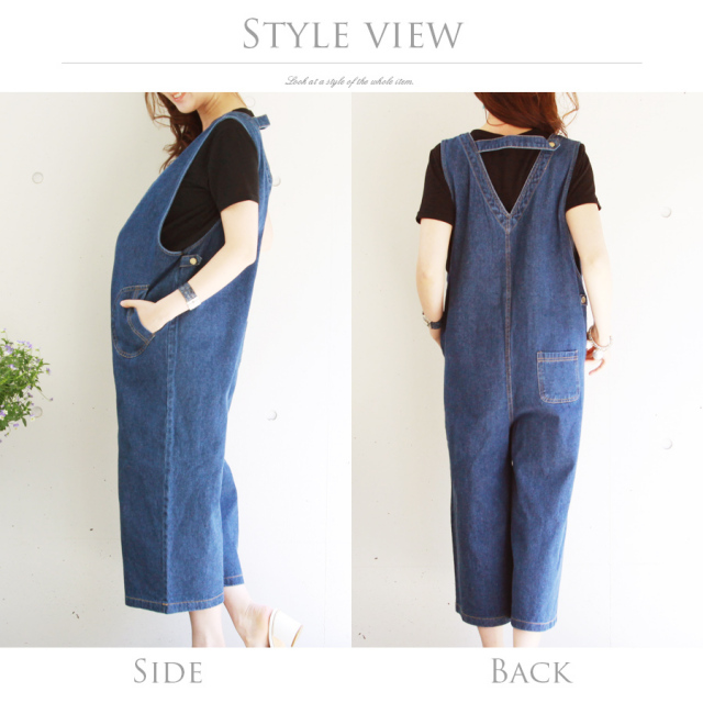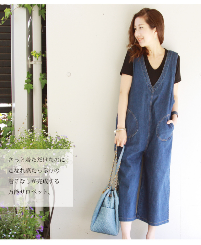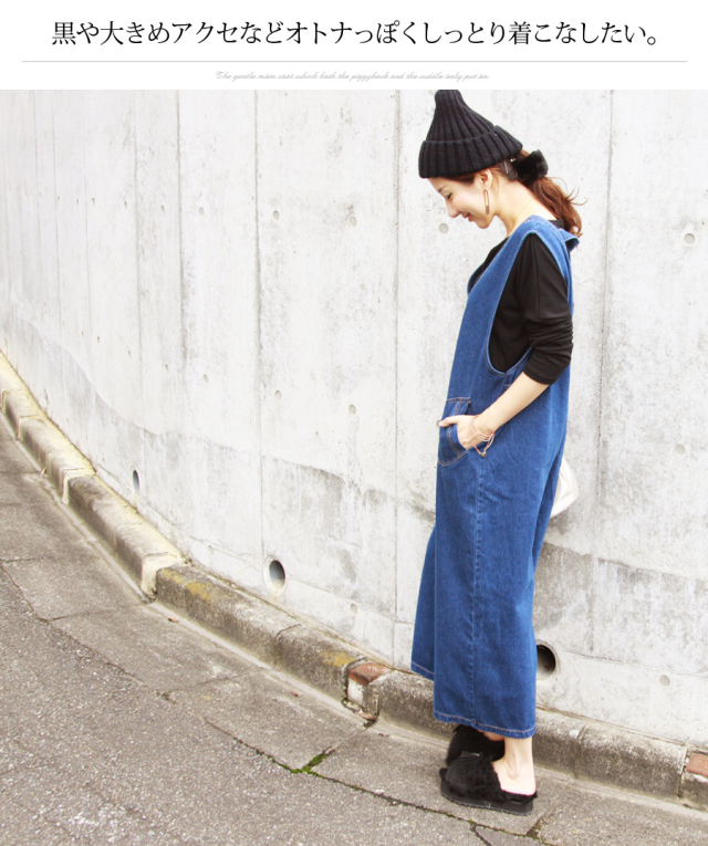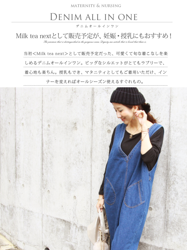 授乳でき、マタニティとしても着られるデニムのサロペット。さっと着るだけで体型カバーしながら旬な着こなしに。