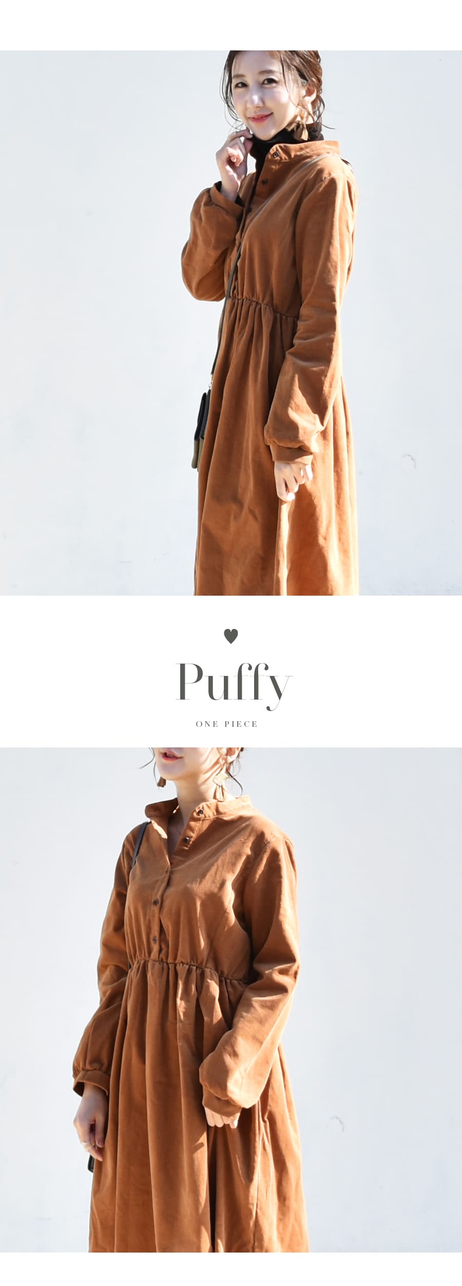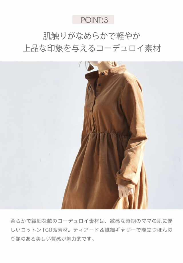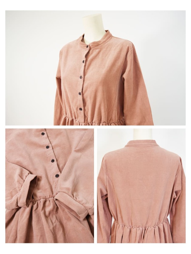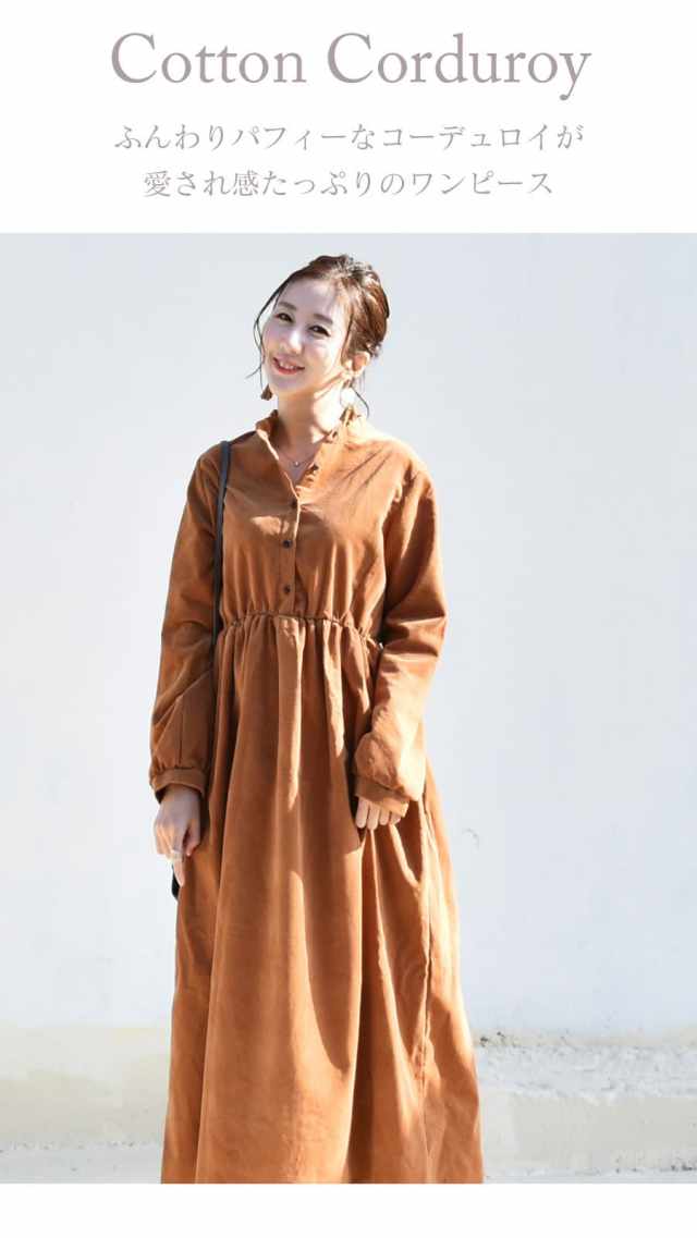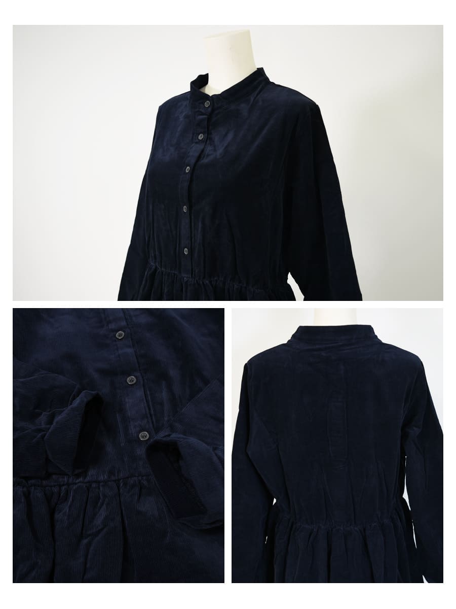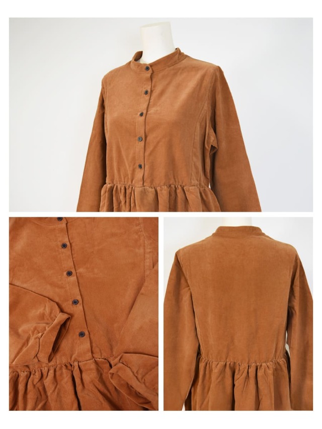 柔らかく肌触りの良いコーデュロイを使った、ころんとしたフォルムが愛らしいワンピース。ハイウエストから広がるギャザーや、ふんわりとした袖口など甘さを感じさせながら、長めの丈感やコーデュロイのヴィンテージ感でぴりっと大人っぽい一枚です。
