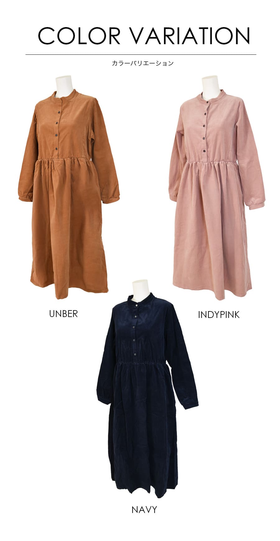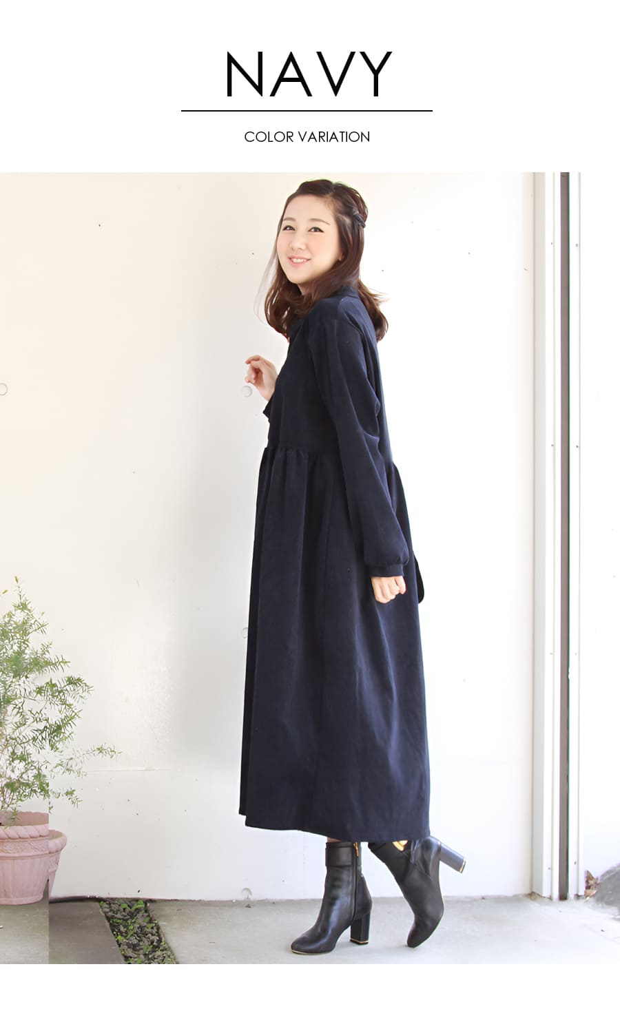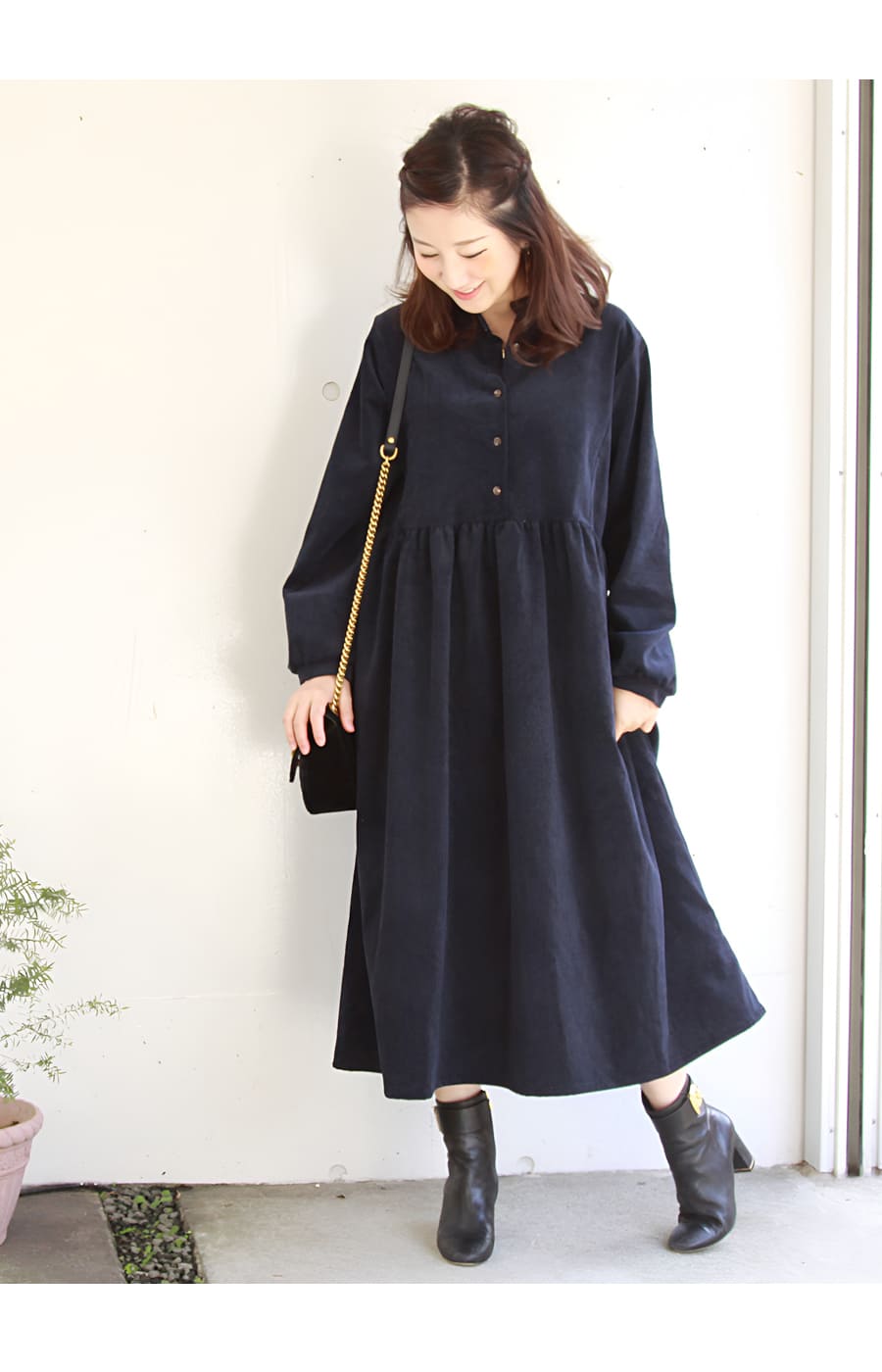 柔らかく肌触りの良いコーデュロイを使った、ころんとしたフォルムが愛らしいワンピース。ハイウエストから広がるギャザーや、ふんわりとした袖口など甘さを感じさせながら、長めの丈感やコーデュロイのヴィンテージ感でぴりっと大人っぽい一枚です。