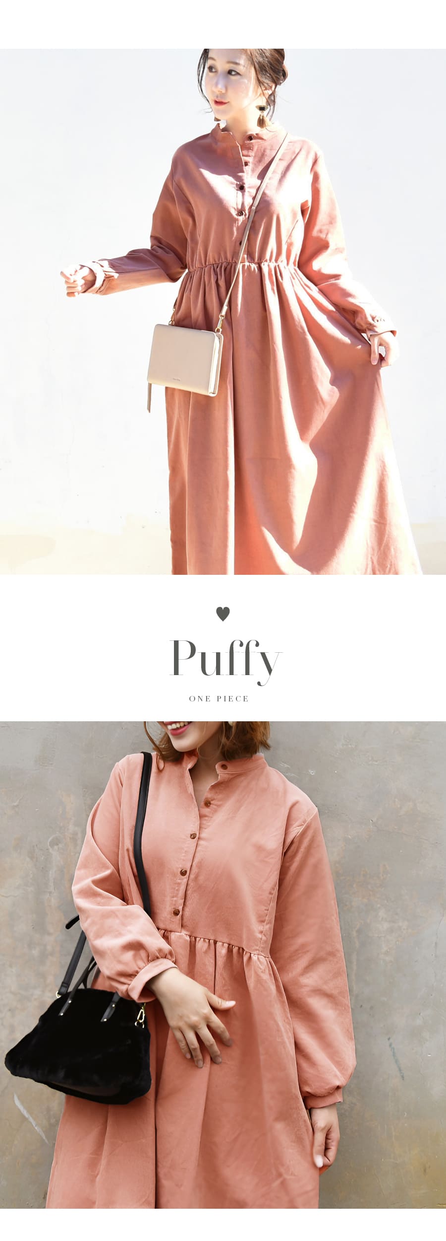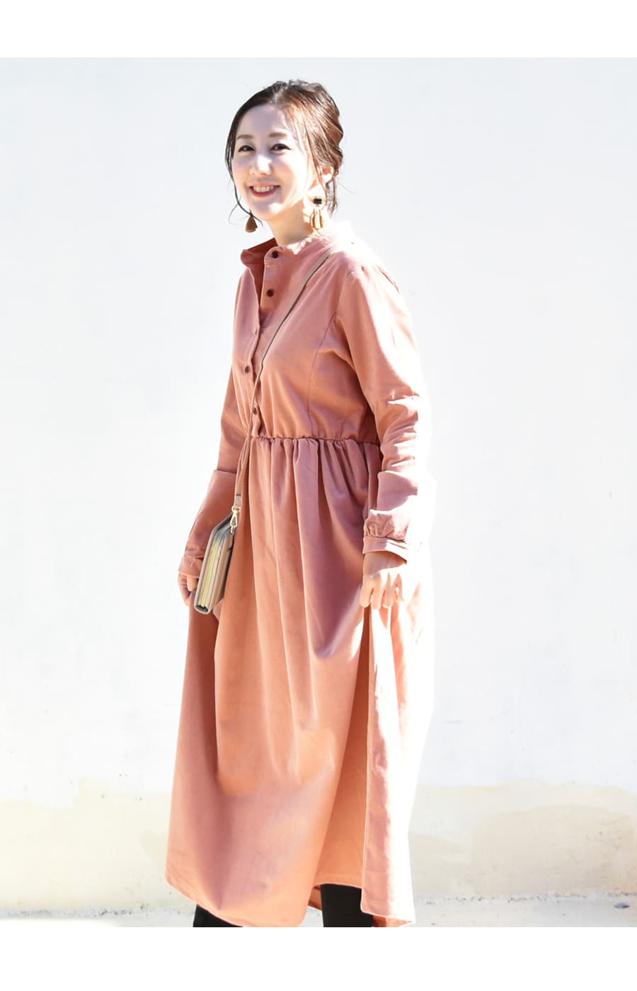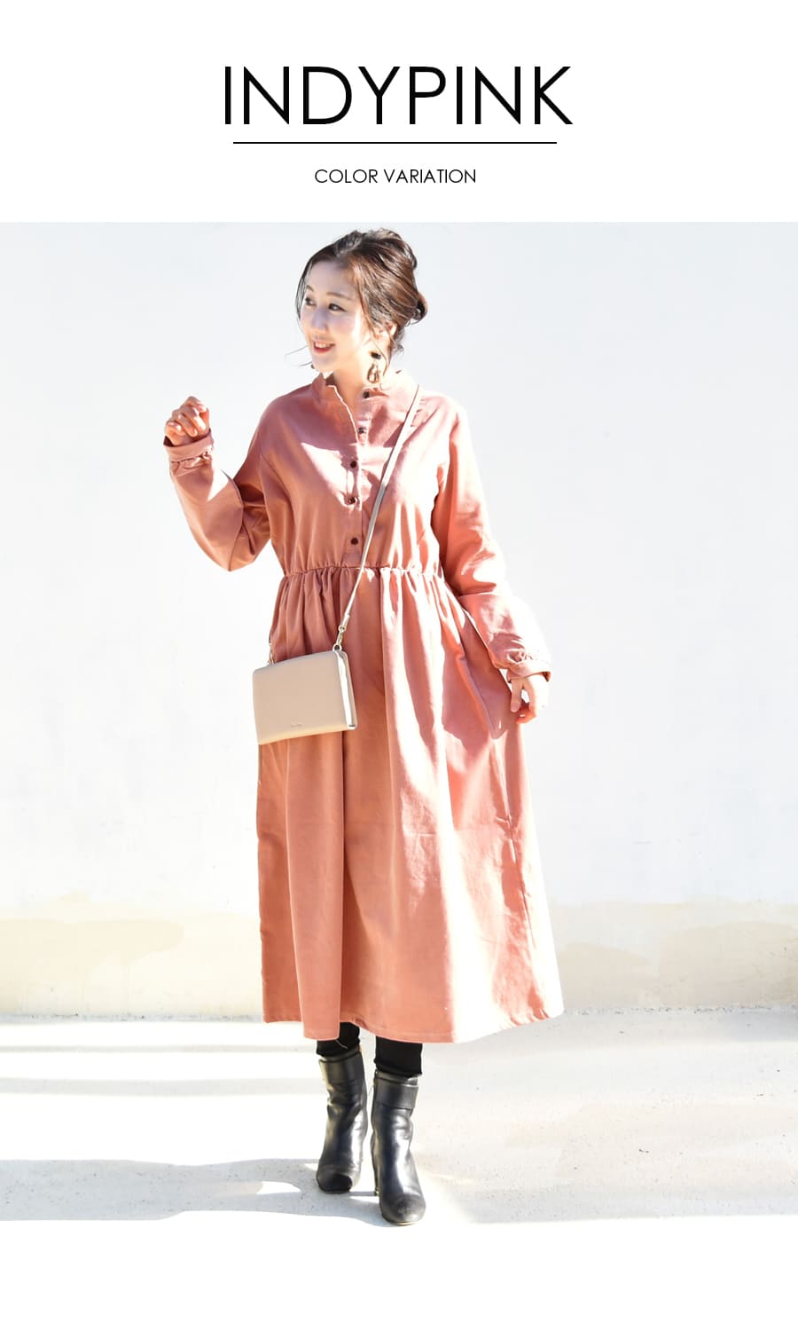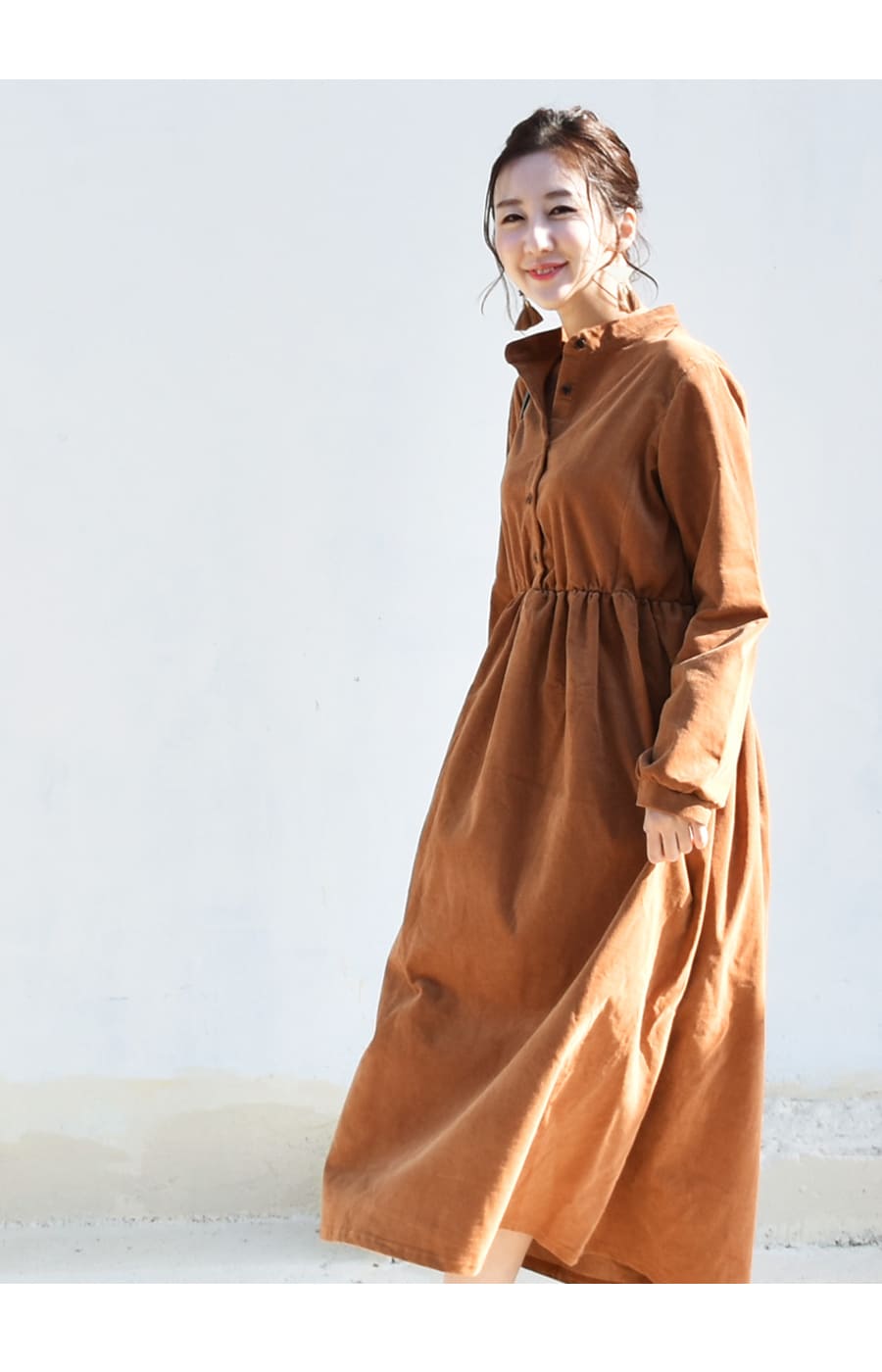 柔らかく肌触りの良いコーデュロイを使った、ころんとしたフォルムが愛らしいワンピース。ハイウエストから広がるギャザーや、ふんわりとした袖口など甘さを感じさせながら、長めの丈感やコーデュロイのヴィンテージ感でぴりっと大人っぽい一枚です。