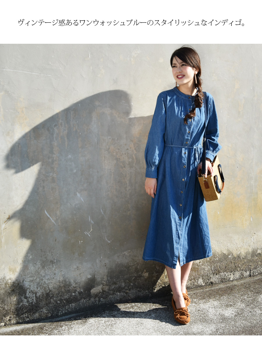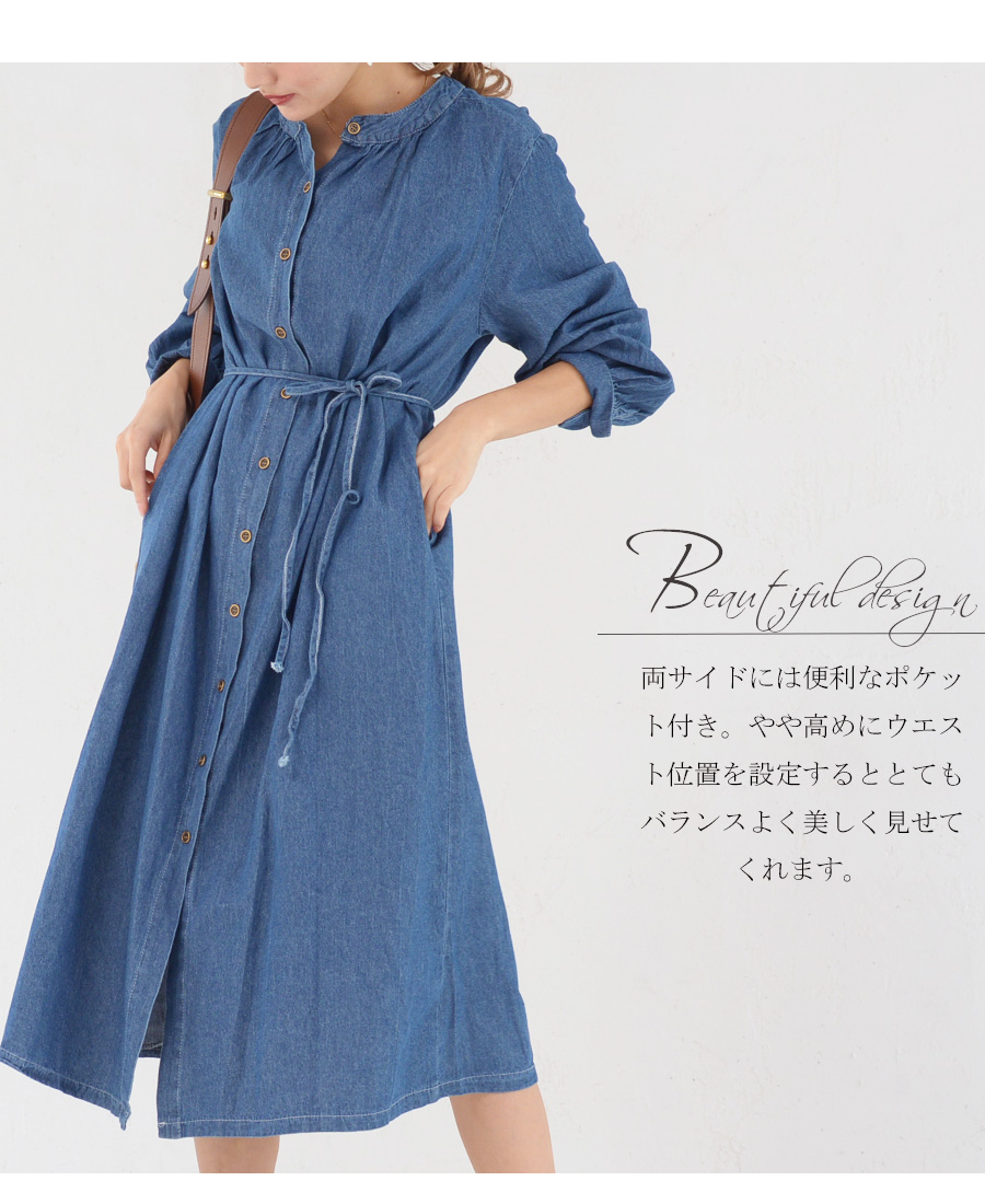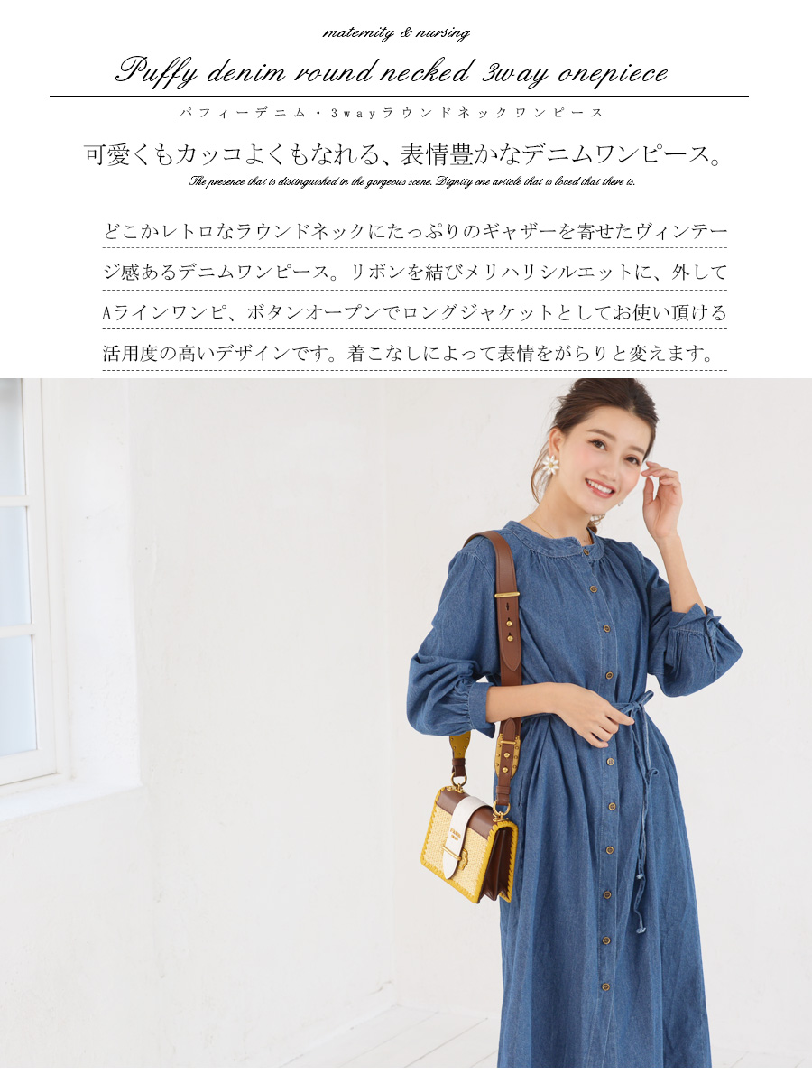 どこかレトロなラウンドネックにたっぷりのギャザーを寄せたヴィンテージ感あるデニムワンピース。
