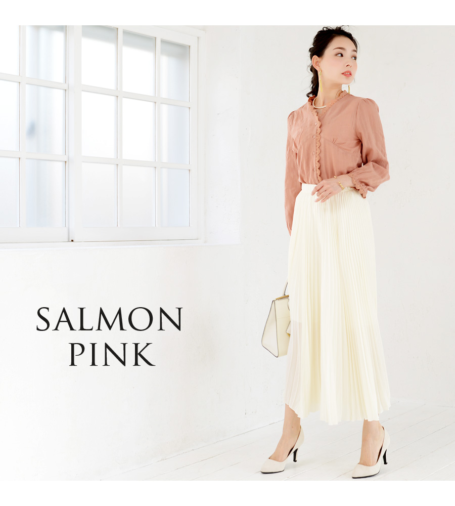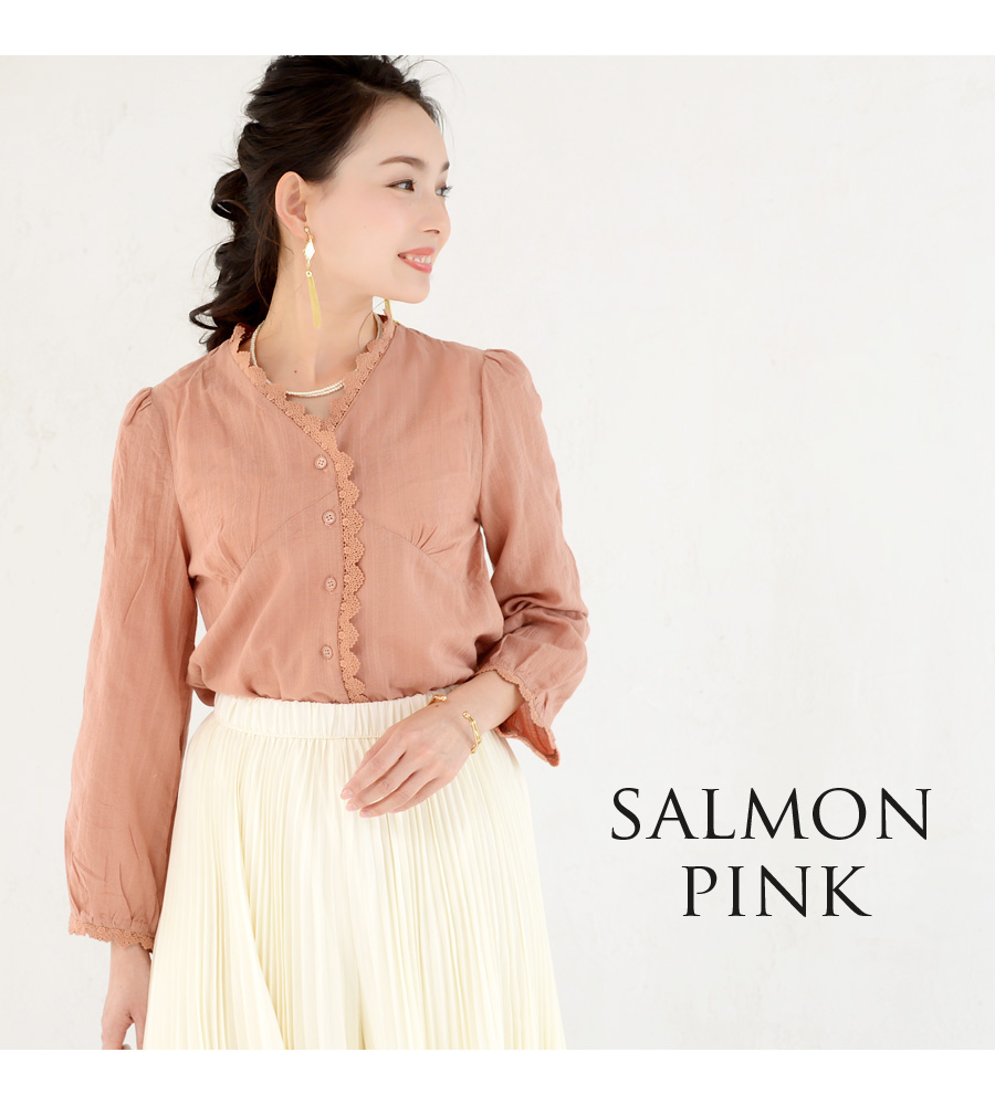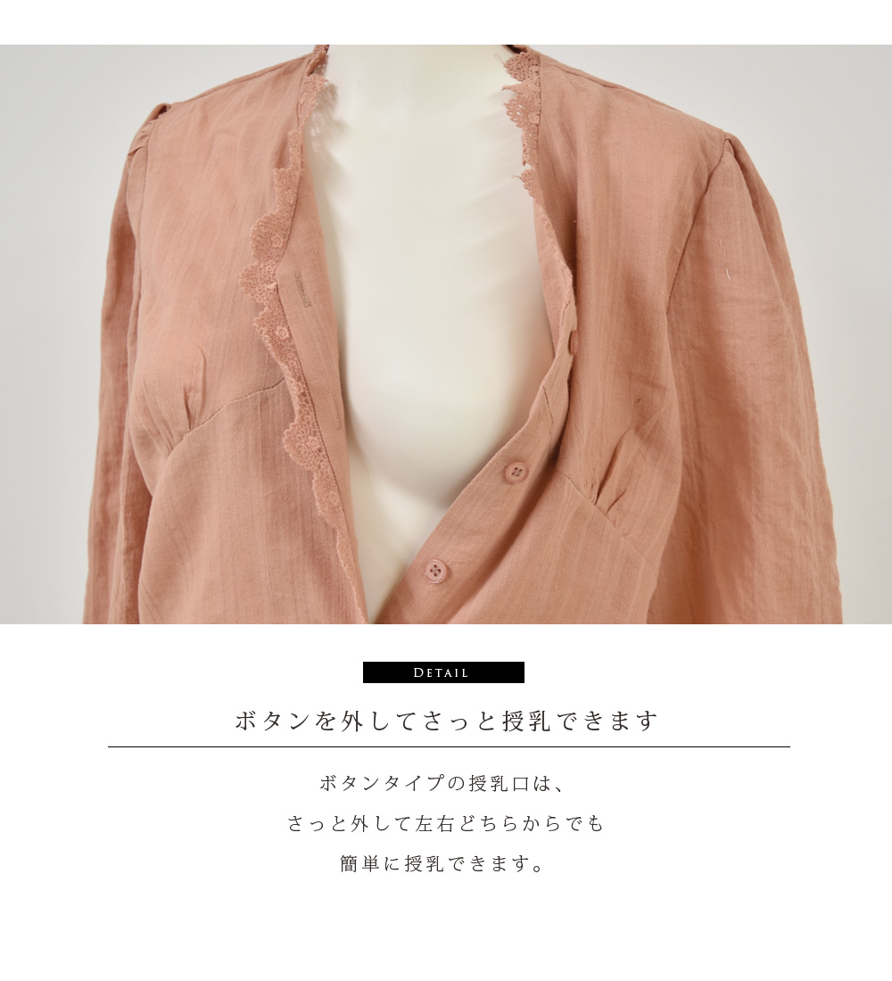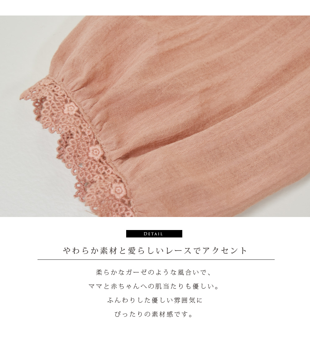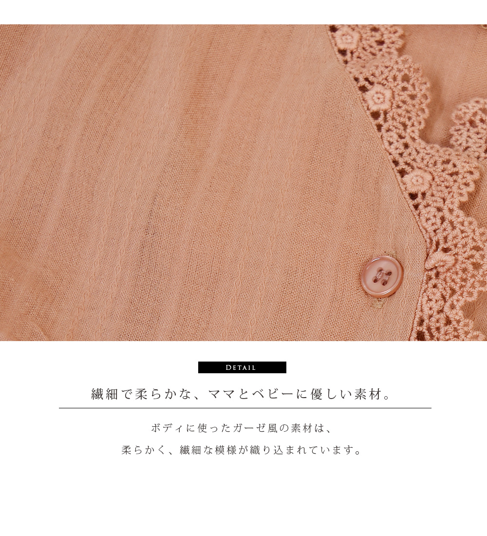 アンティーク風のレースを使った、ガーゼのような柔らかな素材感が可愛い、大人のレースブラウス。春に似合うエクリュとサーモンピンクのカラーは、キレイめでもデニム系カジュアルでも似合う、コーデが楽しくなる一枚です。柔らかな素材は赤ちゃんにも優しいので安心。ボタンを外して、左右どちらからでもさっと授乳できます。