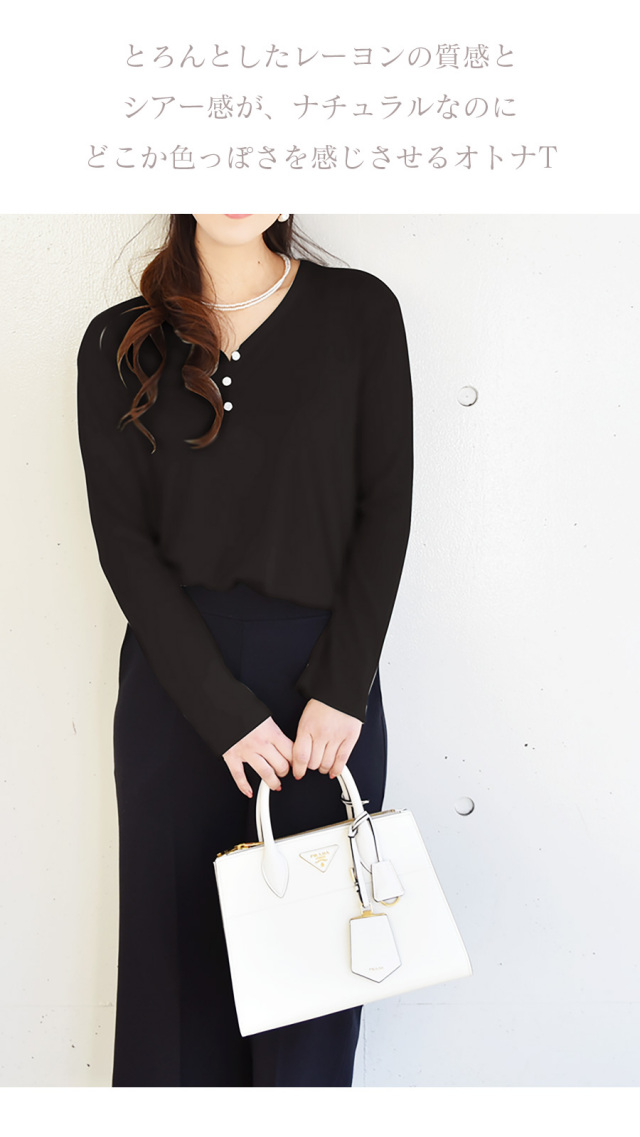 とろんとしたレーヨンの質感とシアー感が、ナチュラルなのにどこか色っぽさを感じさせるオトナT。