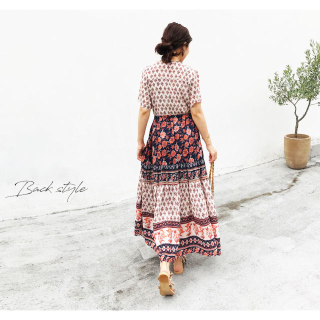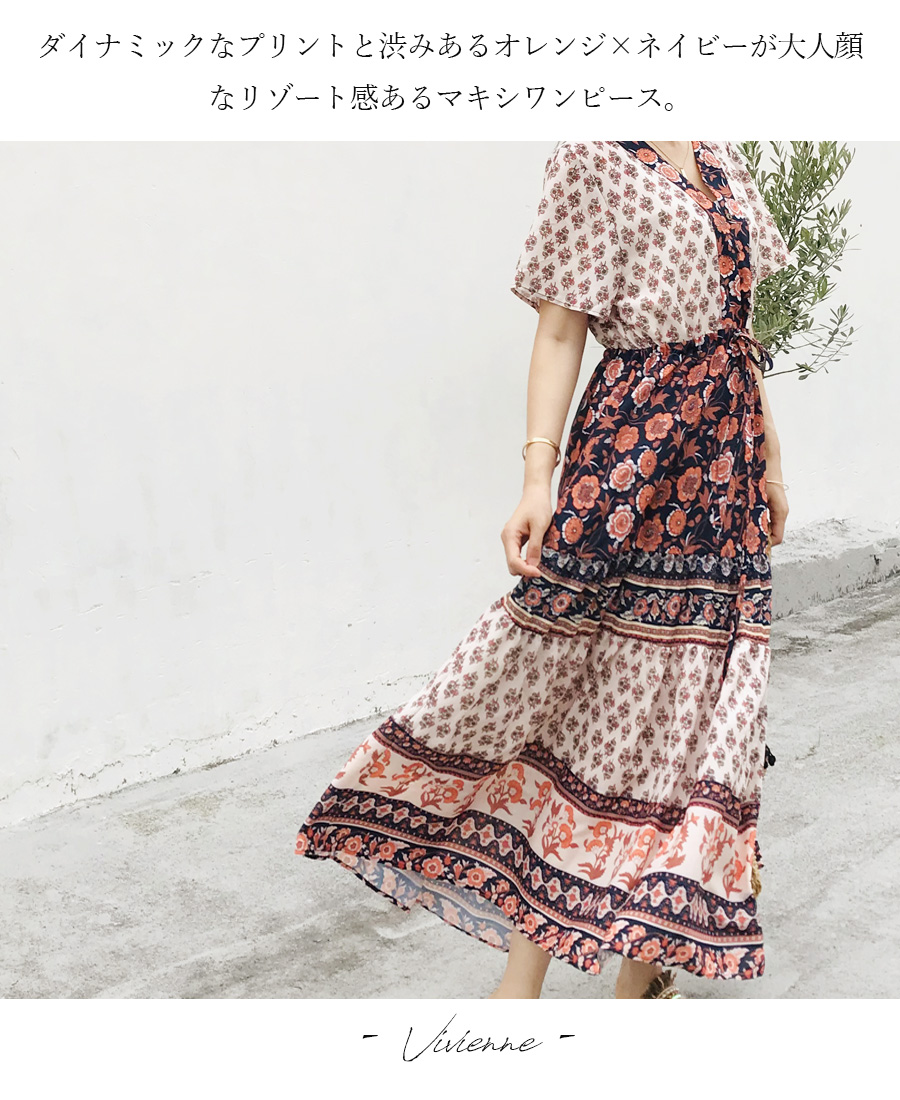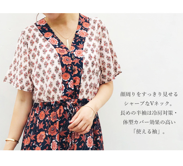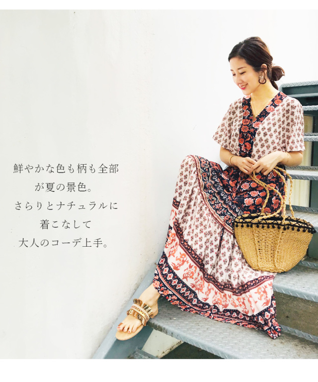 夏の日差しに映えるオレンジベースのエスニック柄は、華やかながらも大人っぽくしっとりと着ていただけます。