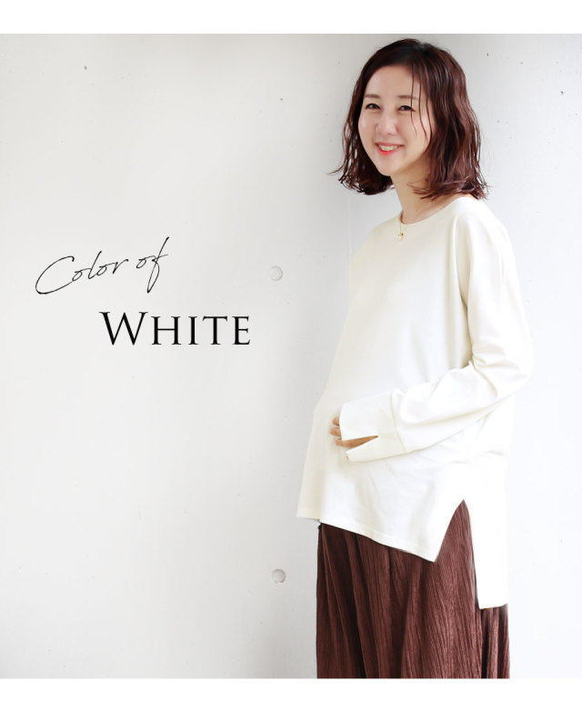 袖部分に入れたスリットは小粋なディテールとお洒落なニュアンスを出しつつ、ママの忙しい動きを考え、あくまで動きやすく機能的に。サイドスリットも動きやすく、ボトムスとのレイヤードがキレイに見えるデザインです。