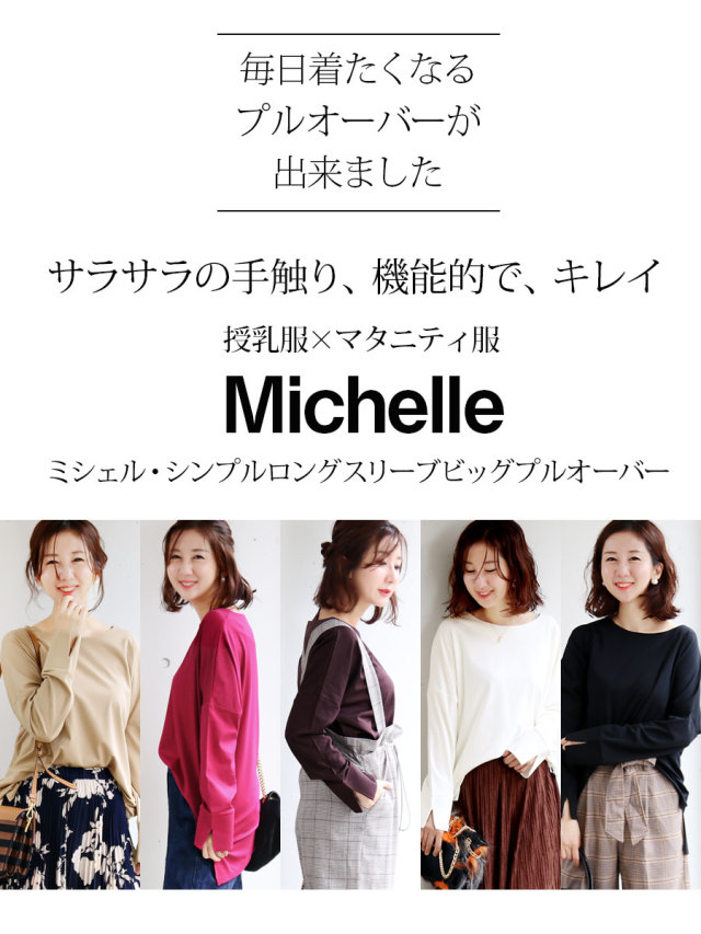 二の腕カバーできる授乳機能付きビッグプルオーバー「ミシェル」は、つるんとした手触りとほんのり光沢感ある素材が本当に気持ちいい生地を使い、スリット、着丈、襟ぐりにこだわってデザインした授乳服機能付きマタニティ対応トップスです。ベーシックなデザイン&カラーの中に、子育て経験ママを考えたデザイン&機能性がいっぱい、毎日のコーデがとにかく楽におしゃれになる一枚です。シンプルなデザインなので、パンツでもスカートでも何でも似合う懐の深さ。細部までこだわったディテールだから、手抜き感なく着られるのも嬉しいポイント。
