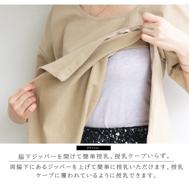 「どこに授乳口があるんですか?」と質問されてしまうほど、さりげなく脇下の切り替え部分に配置したファスナータイプの授乳口。授乳に慣れない初心者ママもさっと授乳できると評判のデザインです。左右どちらからも授乳できます。