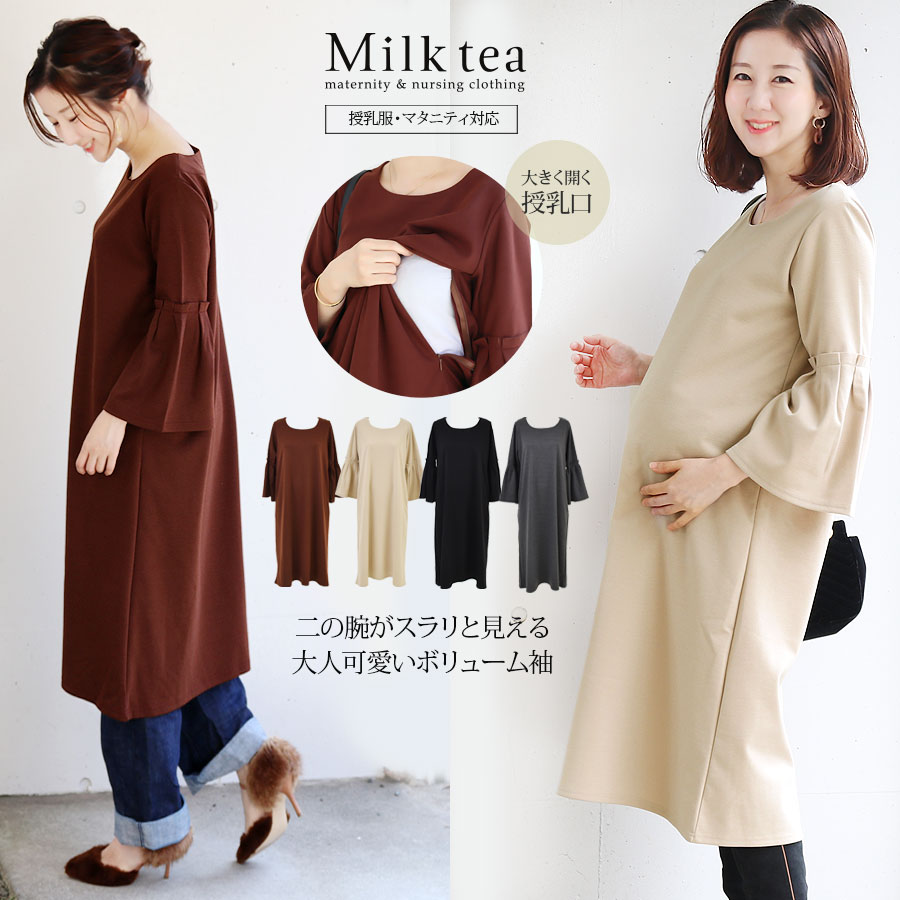 商品カテゴリ:お家で洗える 授乳服 マタニティ服 授乳 マタニティ レディース ワンピース ワンピ チュニック リボン フリル 大きいサイズ M L LL 無地 Milk tea ミルクティー ミルクティ ママ 妊婦 妊婦服