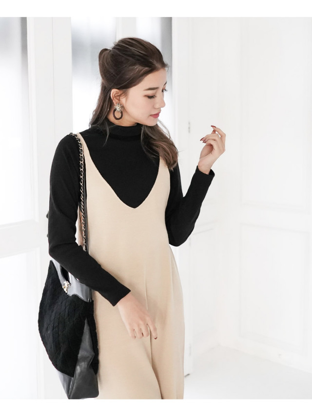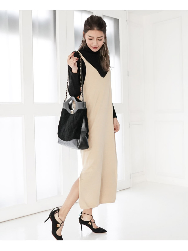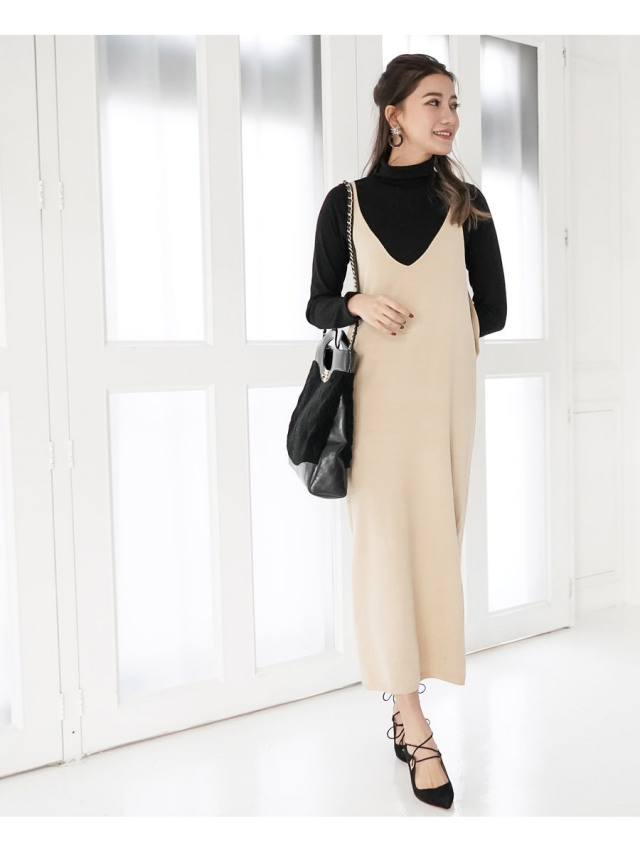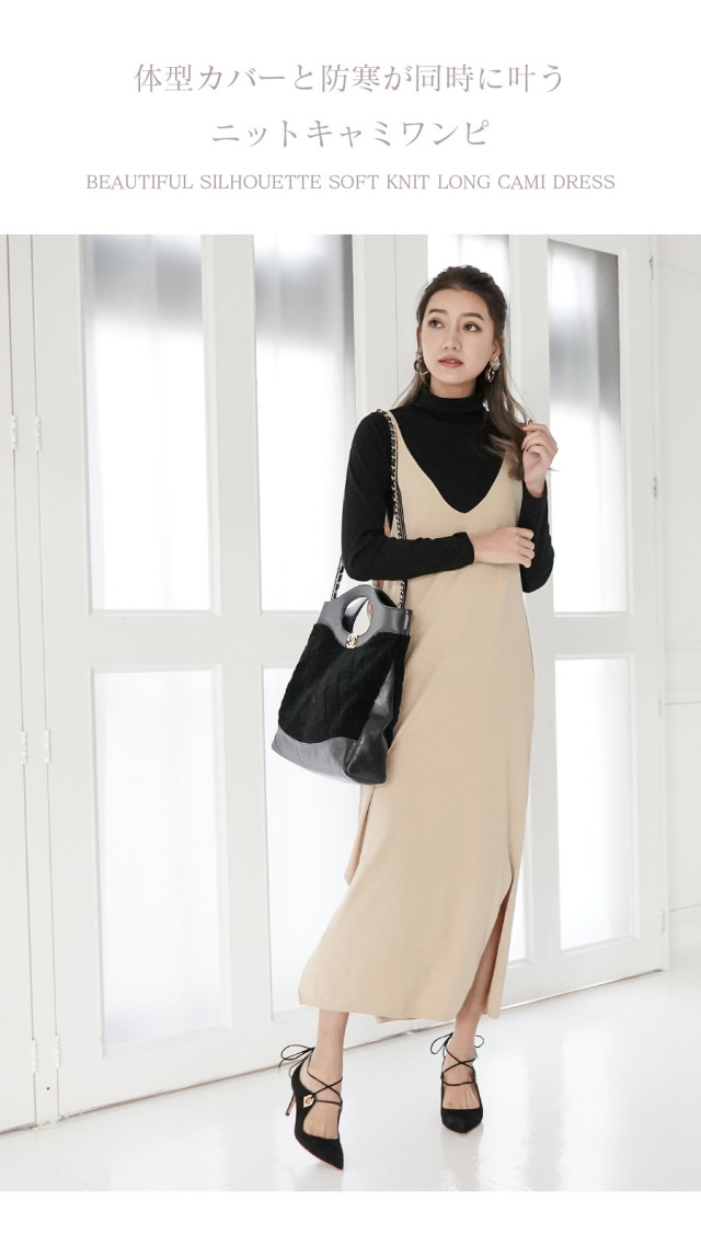 体型カバーと防寒が同時に叶うニットキャミワンピは冬のマスト。