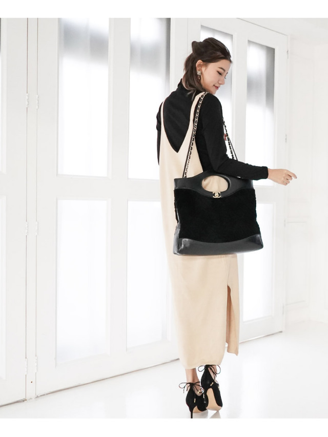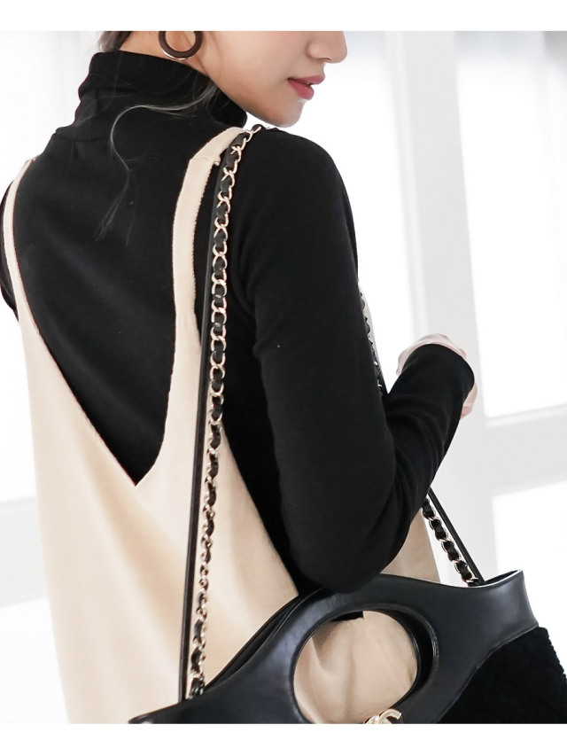 深いVネック、スリットラインで野暮ったくなりがちな重ね着もスリム&脚長効果抜群。