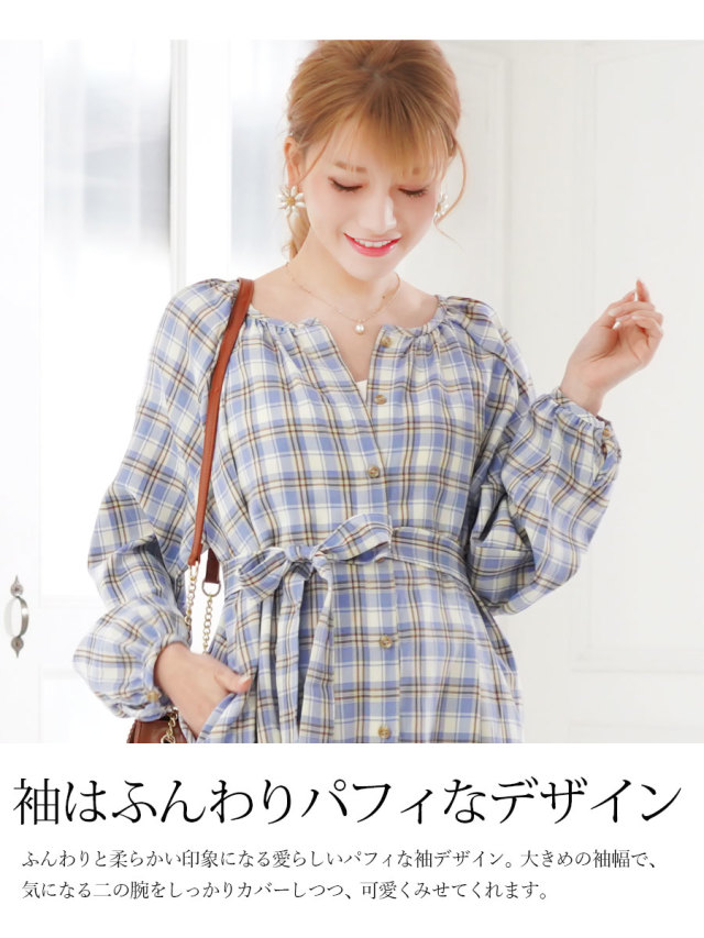 取り外し可能なベルトを使えばコーデや体系に合わせてシルエットが変えられます。気になる二の腕をカバーするふっくらした愛らしいパフィな袖に、気になる部分をカバーできるたっぷりとした身幅なのに、素材感とラインで着痩せ効果も抜群。ともすれば子供っぽくなりがちなチェックワンピースをしっかり大人の雰囲気に仕上げました。