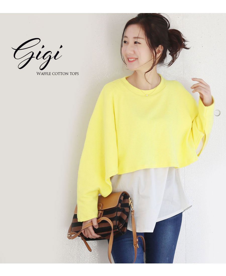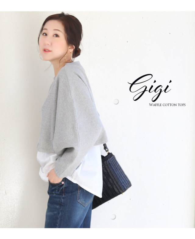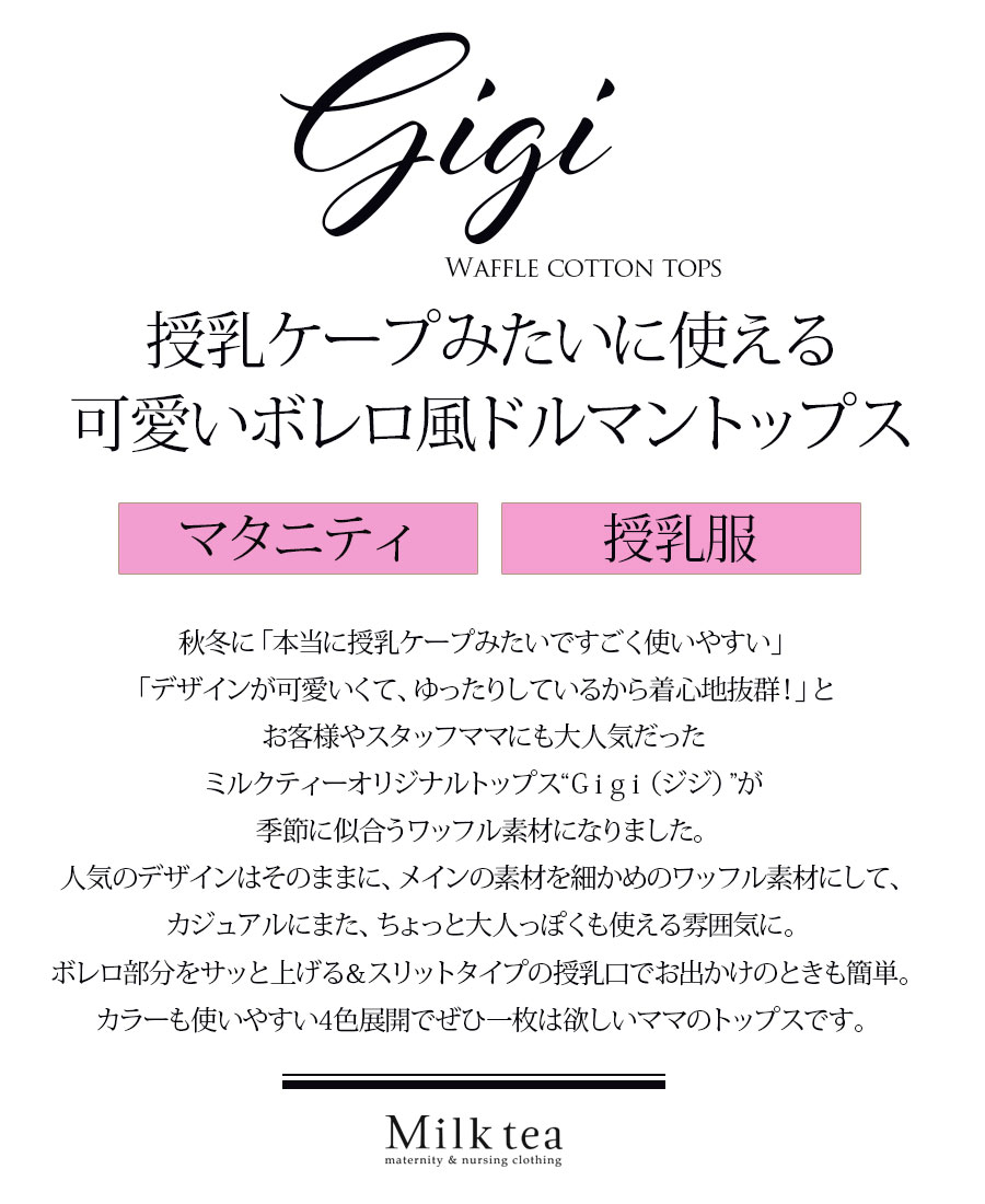 「本当に授乳ケープみたいですごく使いやすい」「デザインが可愛いくて、ゆったりしているから着心地抜群!」「重ね着風だからこれ一枚でおしゃれに見える!」とお客様やスタッフママにも大人気だったミルクティーオリジナルトップス“Gigi(ジジ)”が季節に似合うワッフル素材になりました。