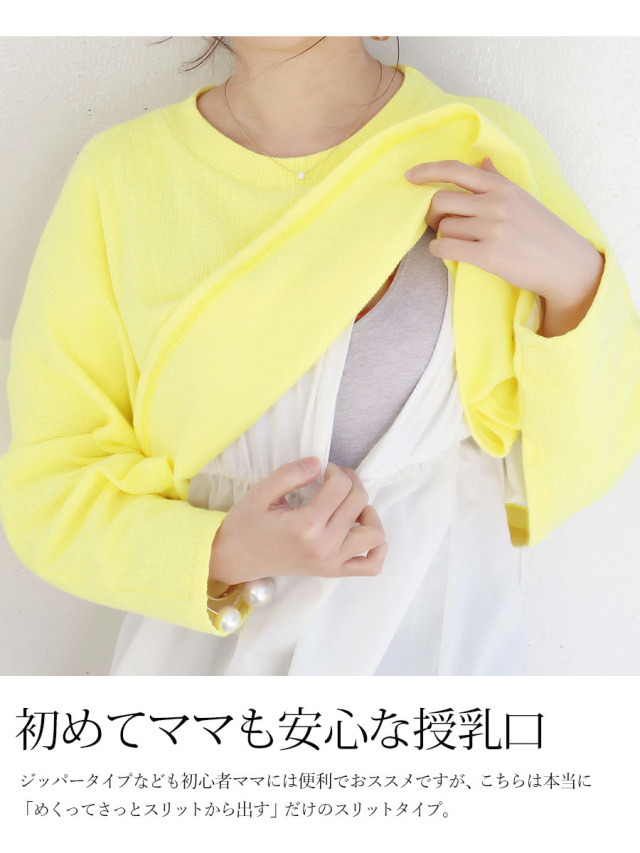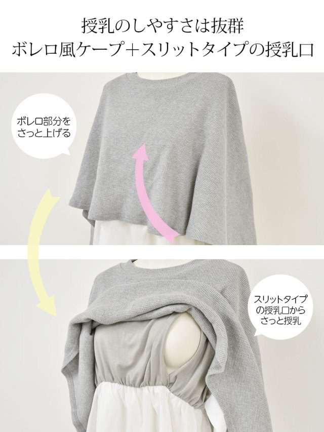 人気のデザインはそのままに、メインの素材を細かめのワッフル素材にして、カジュアルにまた、ちょっと大人っぽくも使える雰囲気に。ボレロ部分をサッと上げる&スリットタイプの授乳口でお出かけのときも簡単です。