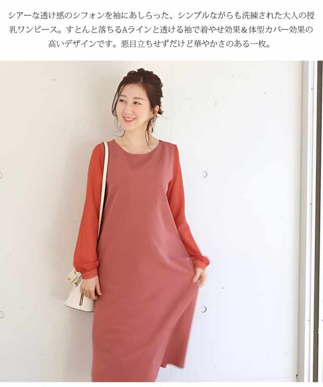 シアーな透け感のシフォンを袖にあしらった、シンプルながらも洗練された大人の授乳ワンピース。