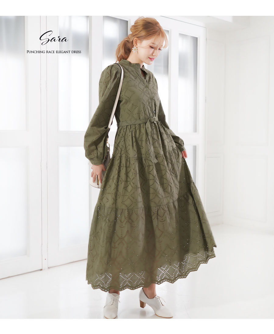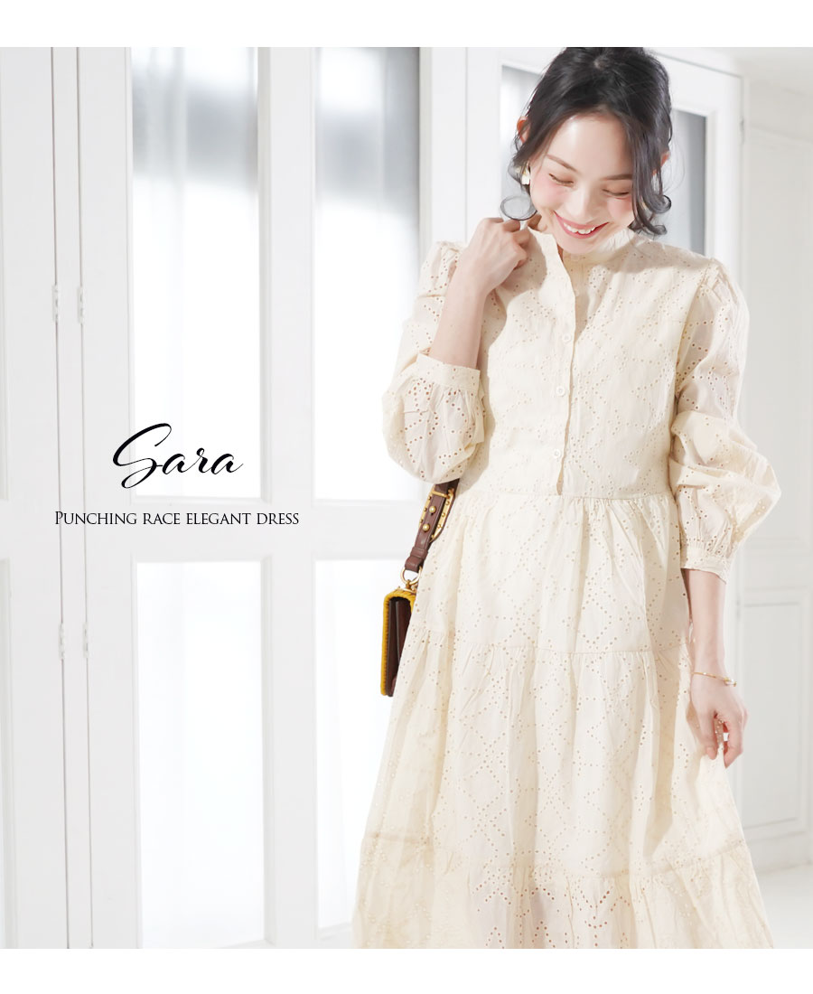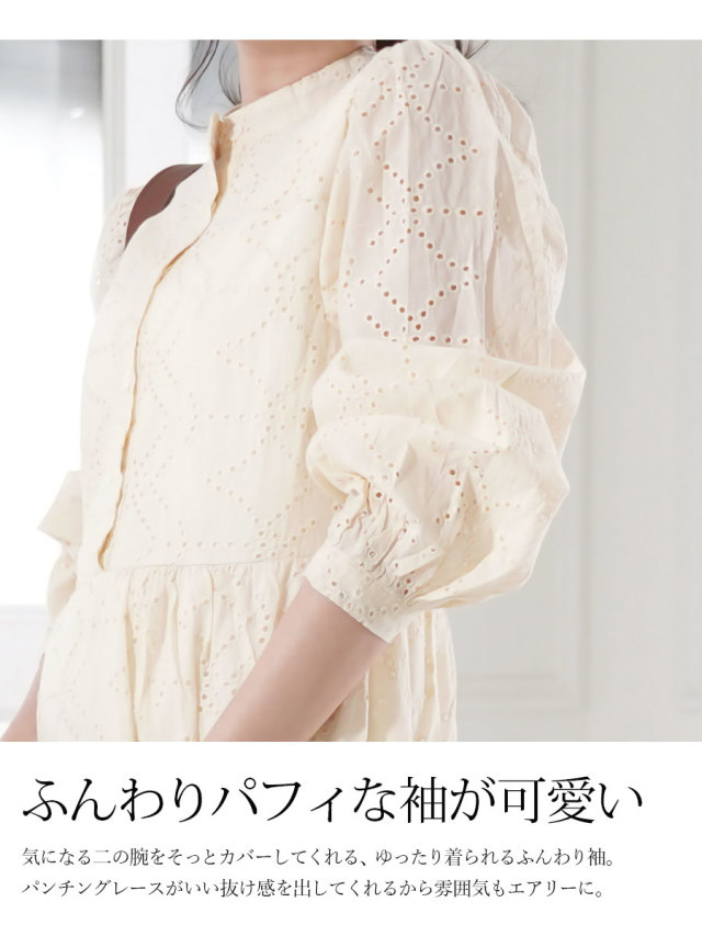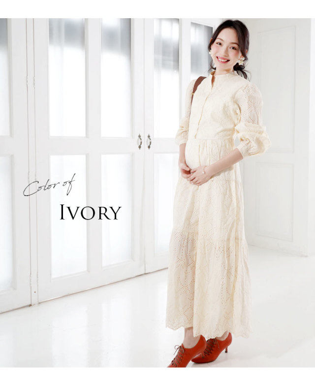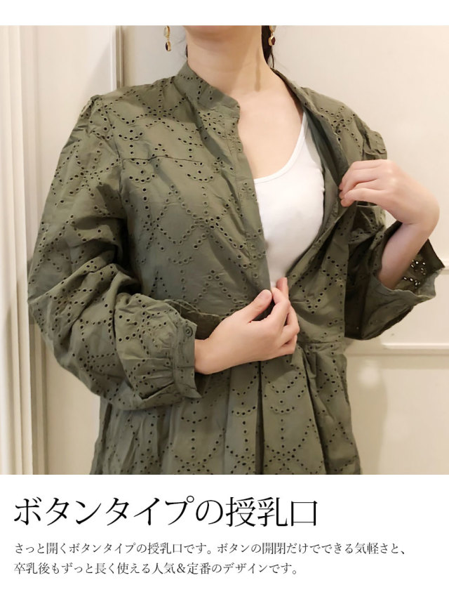 上品な質感のパンチングレースをたっぷり使った、少しレトロでレディなマタニティ&授乳対応ワンピースです。