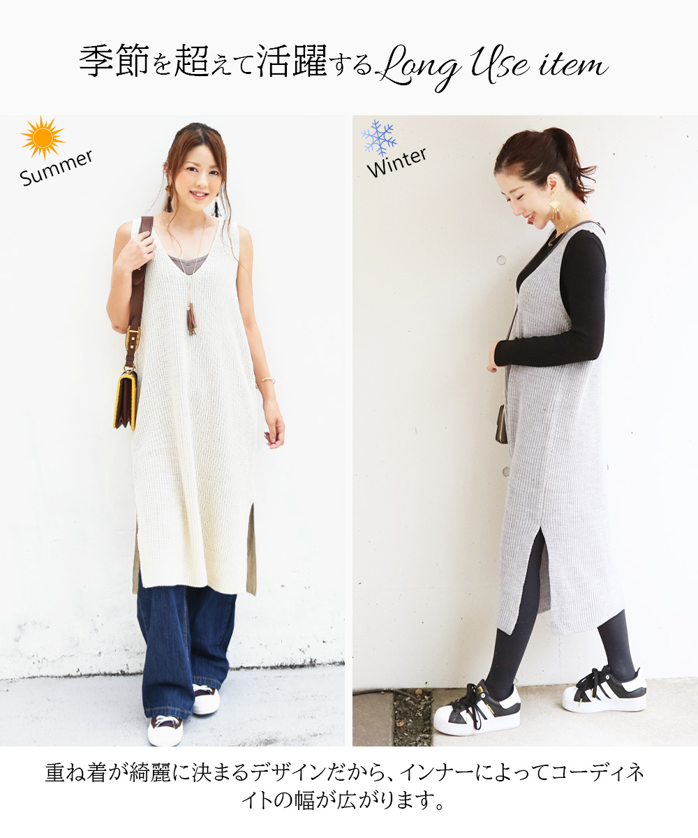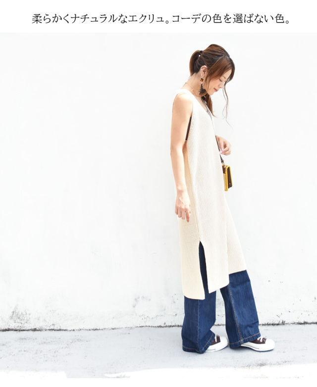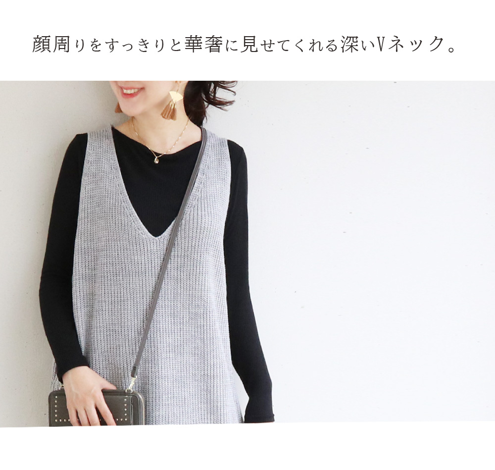 重ね着がきれいに見えるデザインなので、普段のトップス&パンツなどに一つ加えるだけで、