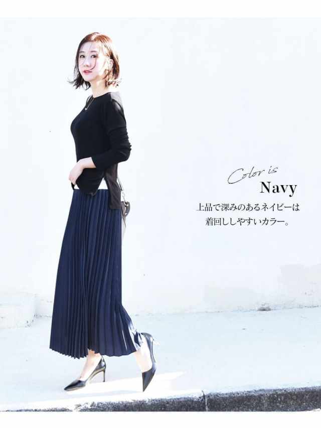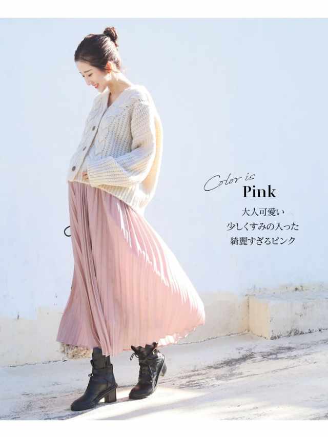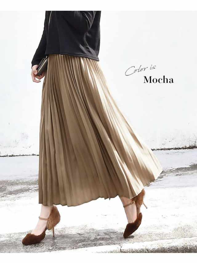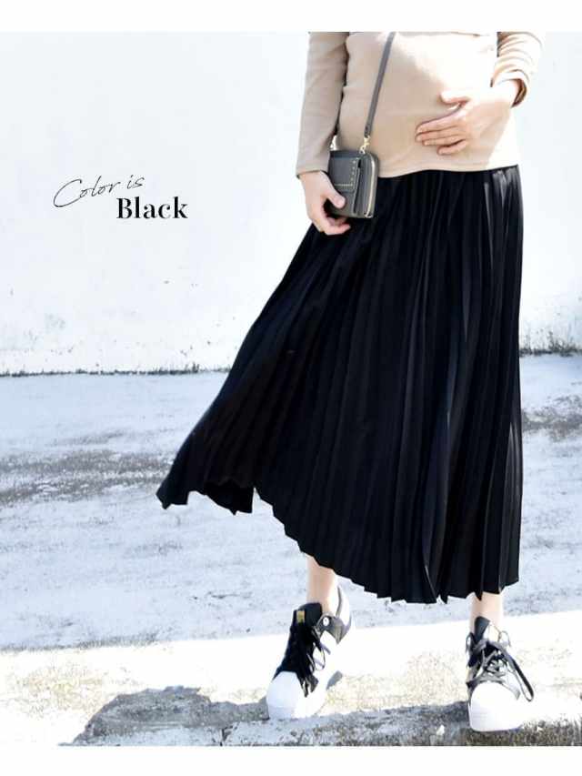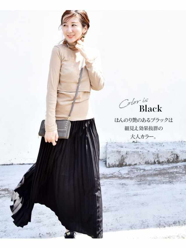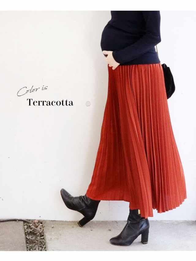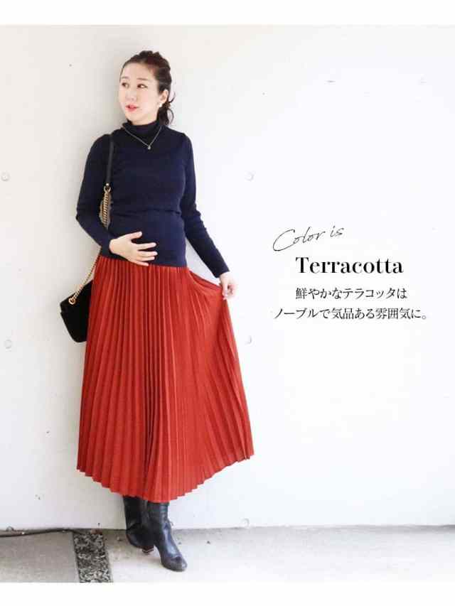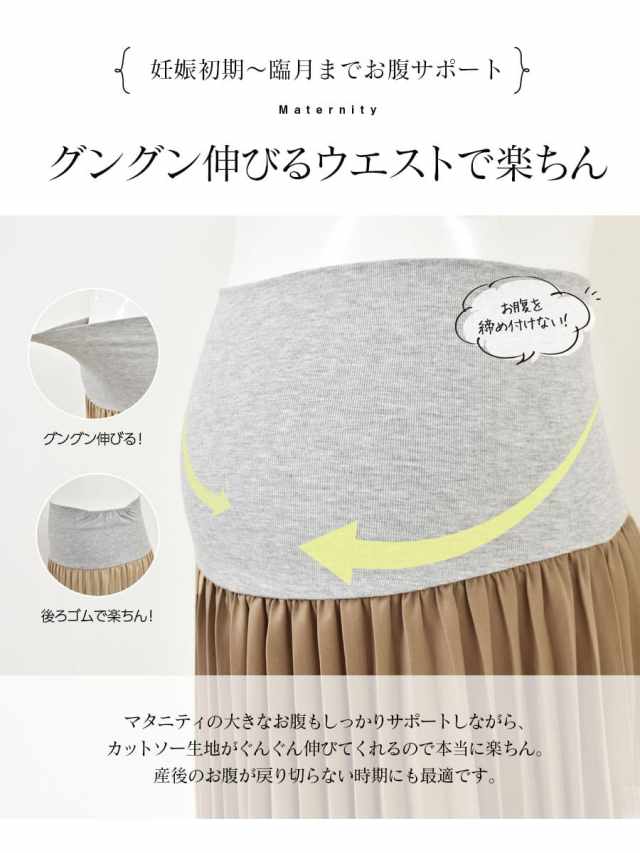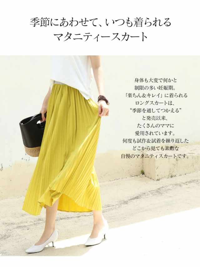 上品な光沢のあるプリーツマタニティースカートです。現役のママスタッフが何回も試作&試着を繰り返してデザインしたスカートは、カラーにもシルエットにもこだわりました。