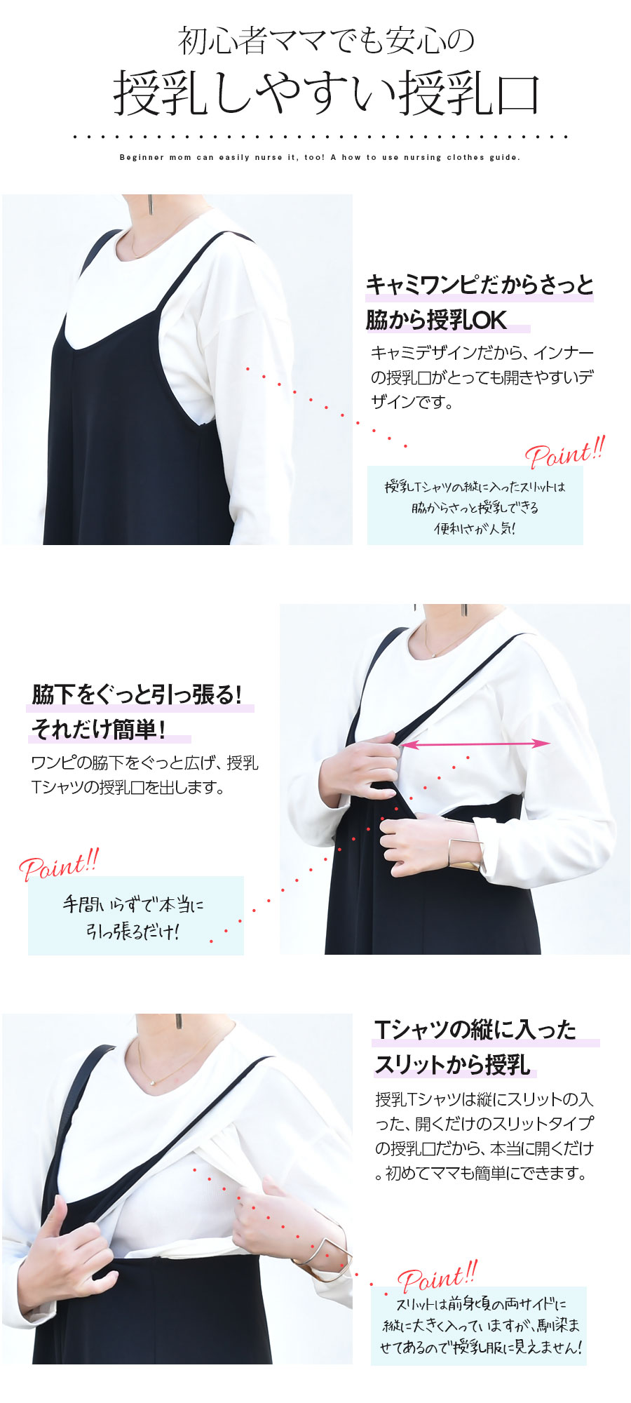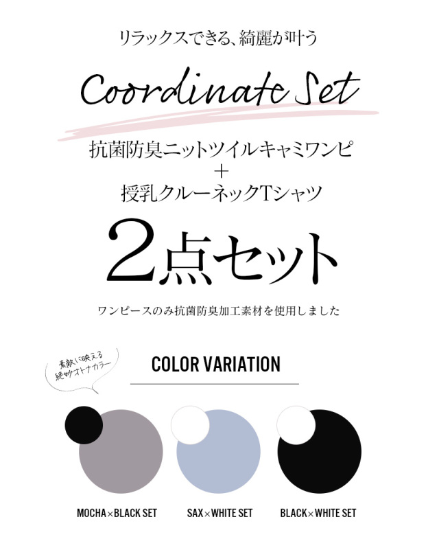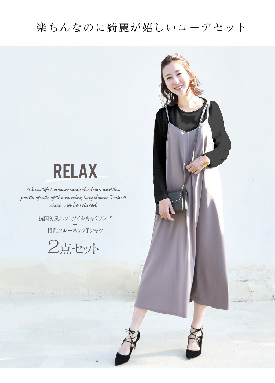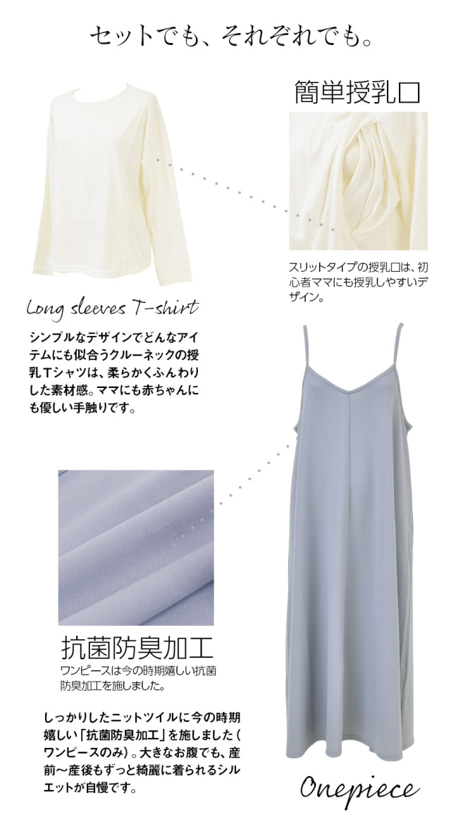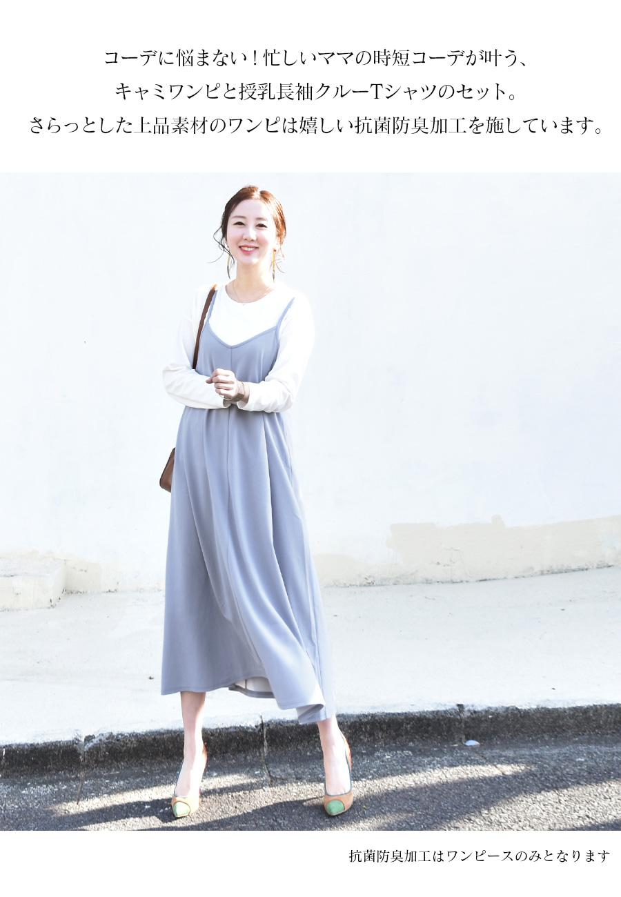 リラックスできる美人でおりこうな抗菌防臭加工を施したキャミワンピと長袖授乳Tシャツのセットです。