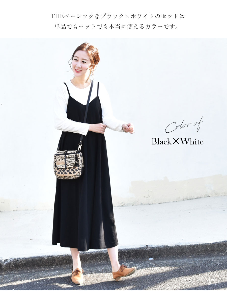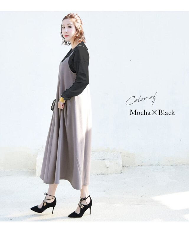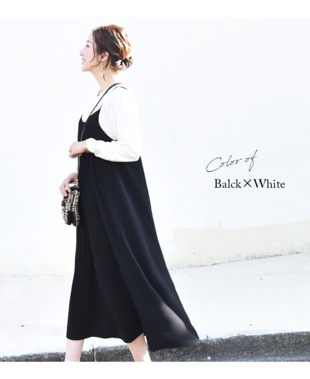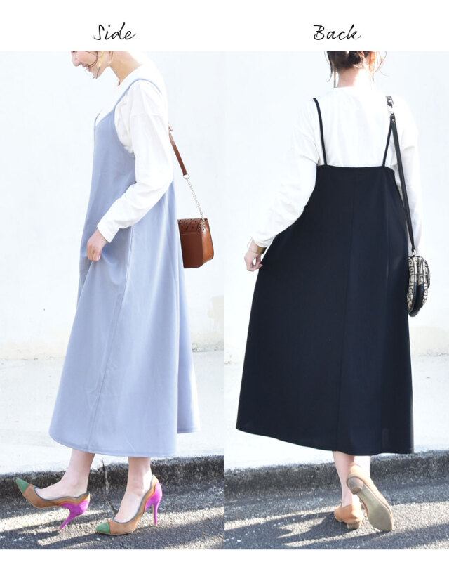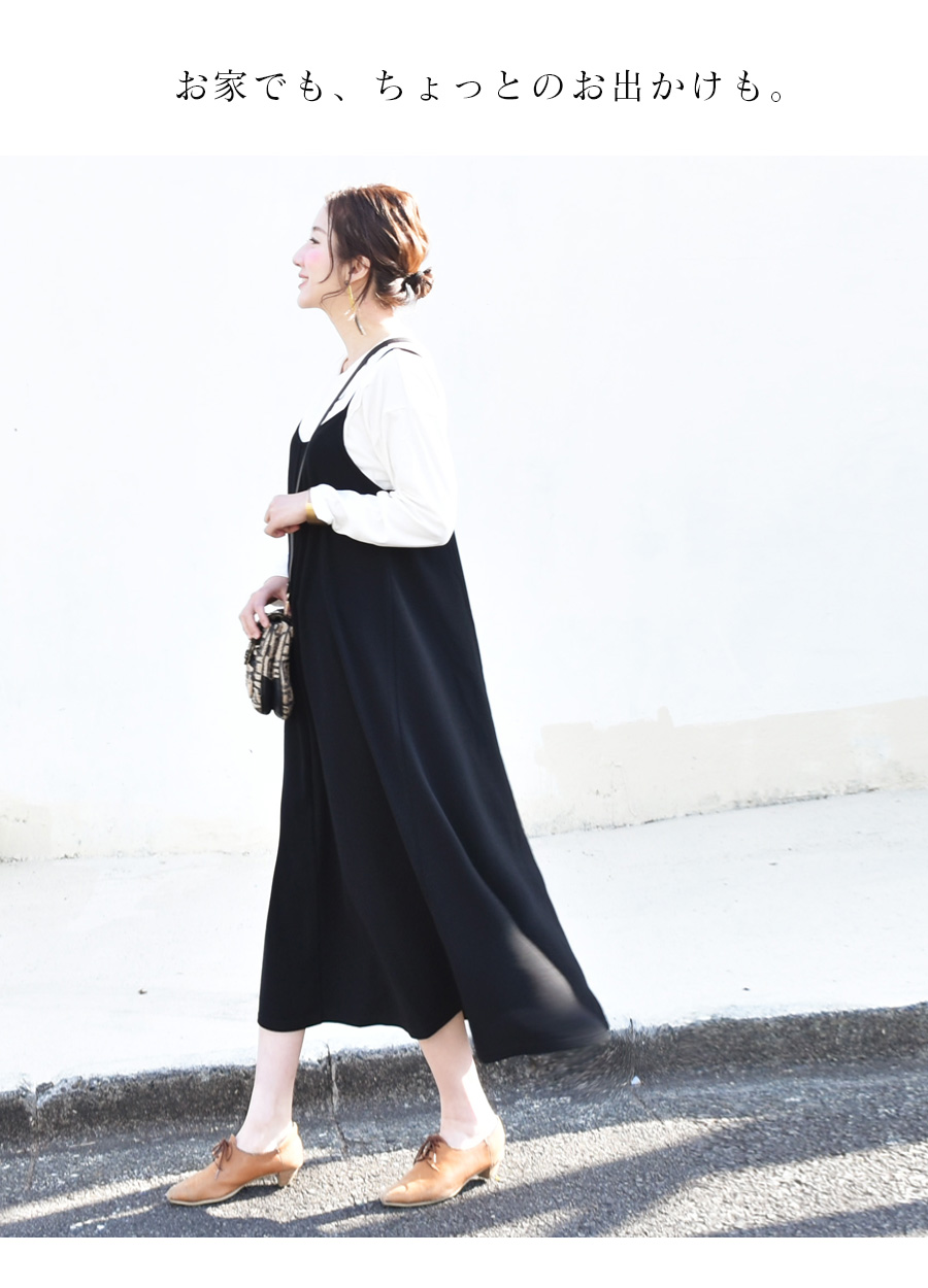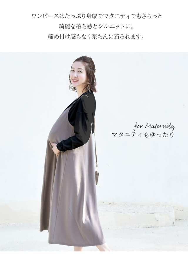 シンプルなのに大きなお腹でも、産前産後も綺麗な落ち感で着られるキャミワンピは、カラーも人気のくすみカラー&ベーシックなブラックをチョイス。
