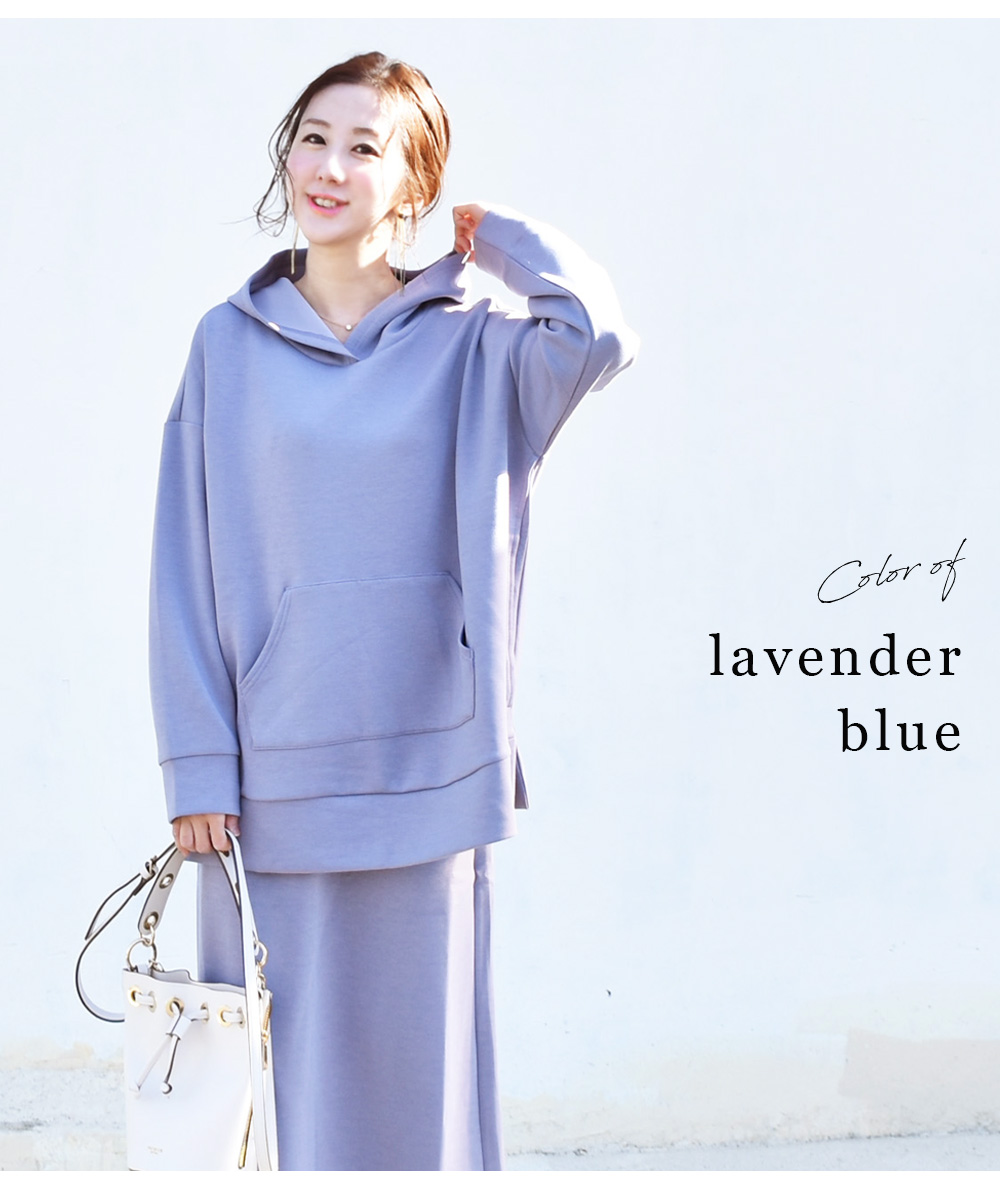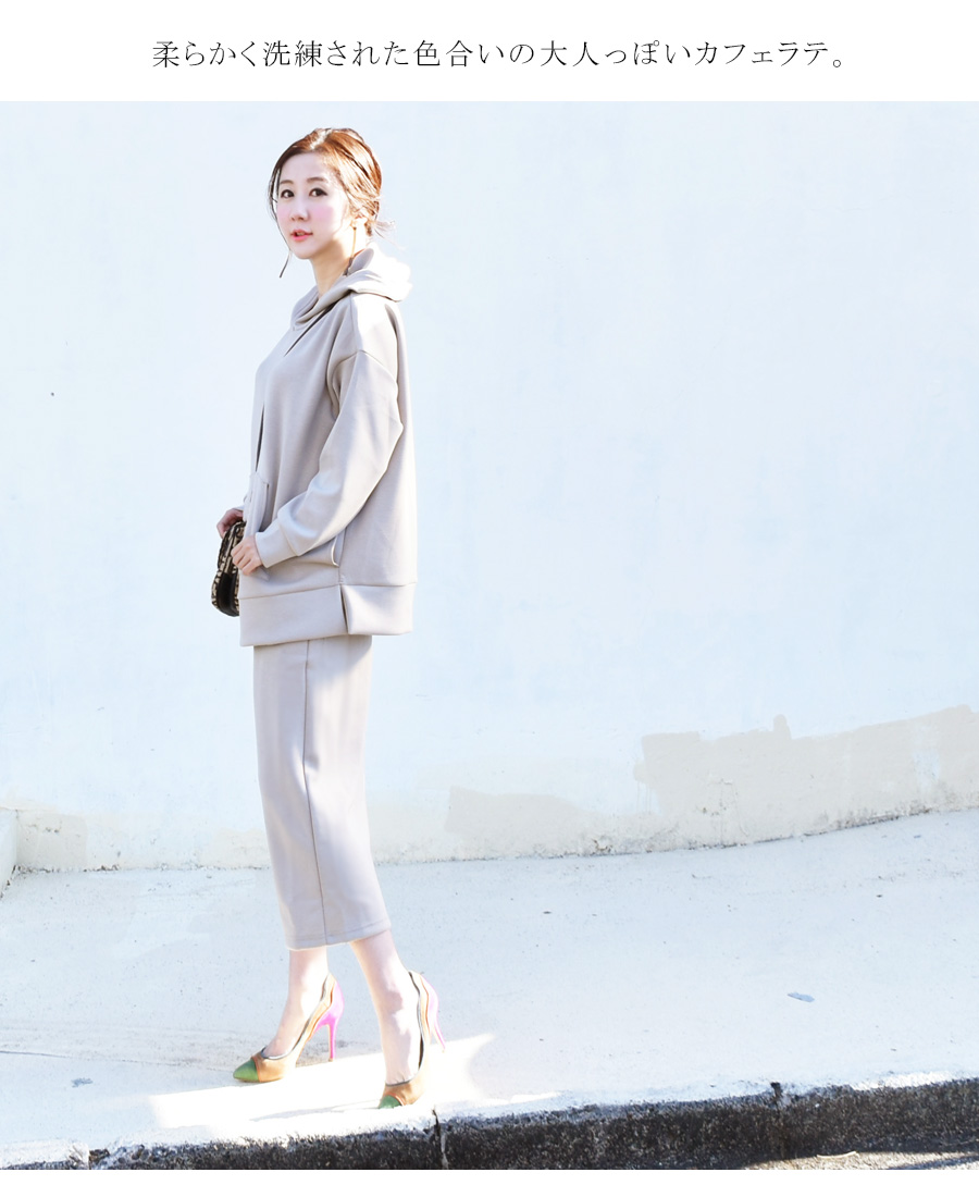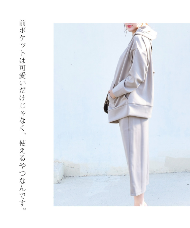 長さのある着丈なのでスキニーやパンツとも好相性。また、別売りマタニティスカートとセットアップで着られます。