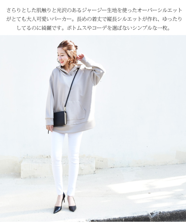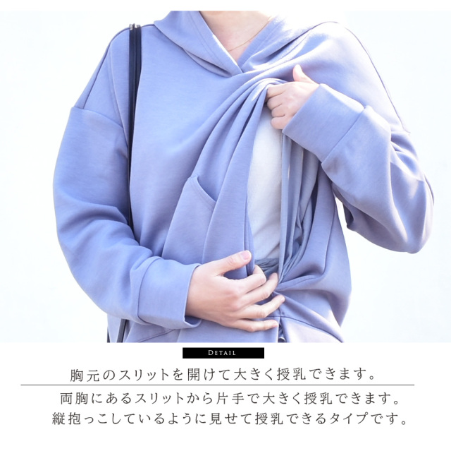 さらさらでもちっとした肌触りがとっても気持ち良い、上品な光沢あるジャージー生地を使ったマタニティ&授乳パーカーです。 ざっくりゆったり着れながらも、縦長のシルエットで、体型をスリムにきれいに見せてくれます。 長さのある着丈なのでスキニーやパンツとも好相性。また、別売りマタニティスカートとセットアップで着られます。 冬から春、そして秋と、季節を問わず長く着られる年中素材。しかも抗菌防臭機能付き。 授乳も楽々。 胸元のスリットからさっと片手で授乳でき、縦抱っこしているように見せて授乳できるので、とっさの授乳も手間取りません。