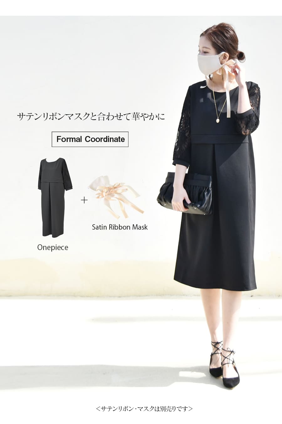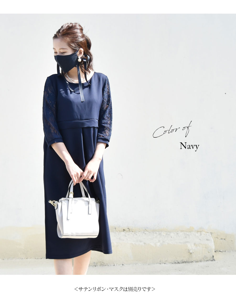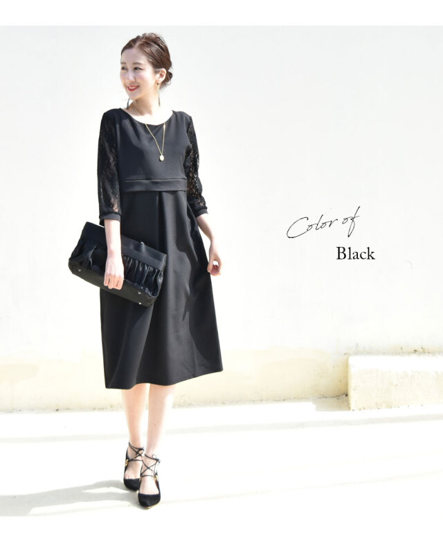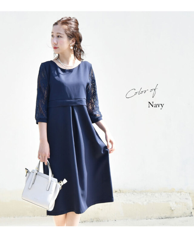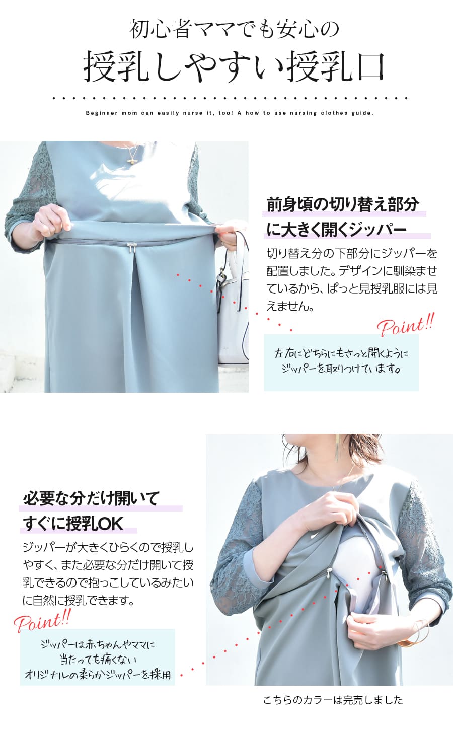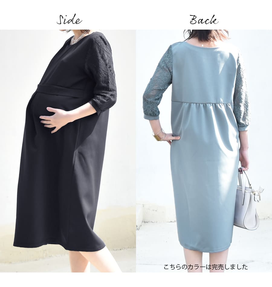 繊細で上品なストレッチレースを使ったスリーブデザインが、優雅で女性らしい雰囲気のフォーマル対応の授乳ワンピース。