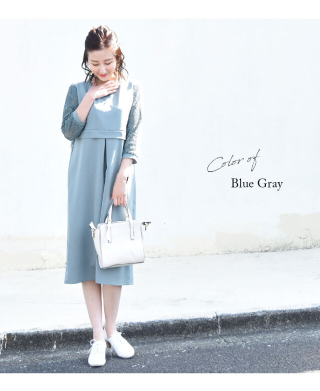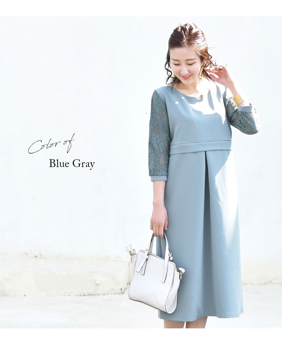 繊細で上品なストレッチレースを使ったスリーブデザインが、優雅で女性らしい雰囲気のフォーマル対応の授乳ワンピース。程よいシルエットのボディはマタニティでもゆったり着られる身幅ながら、それを感じさせないすっきりしたラインに仕上がっています。
