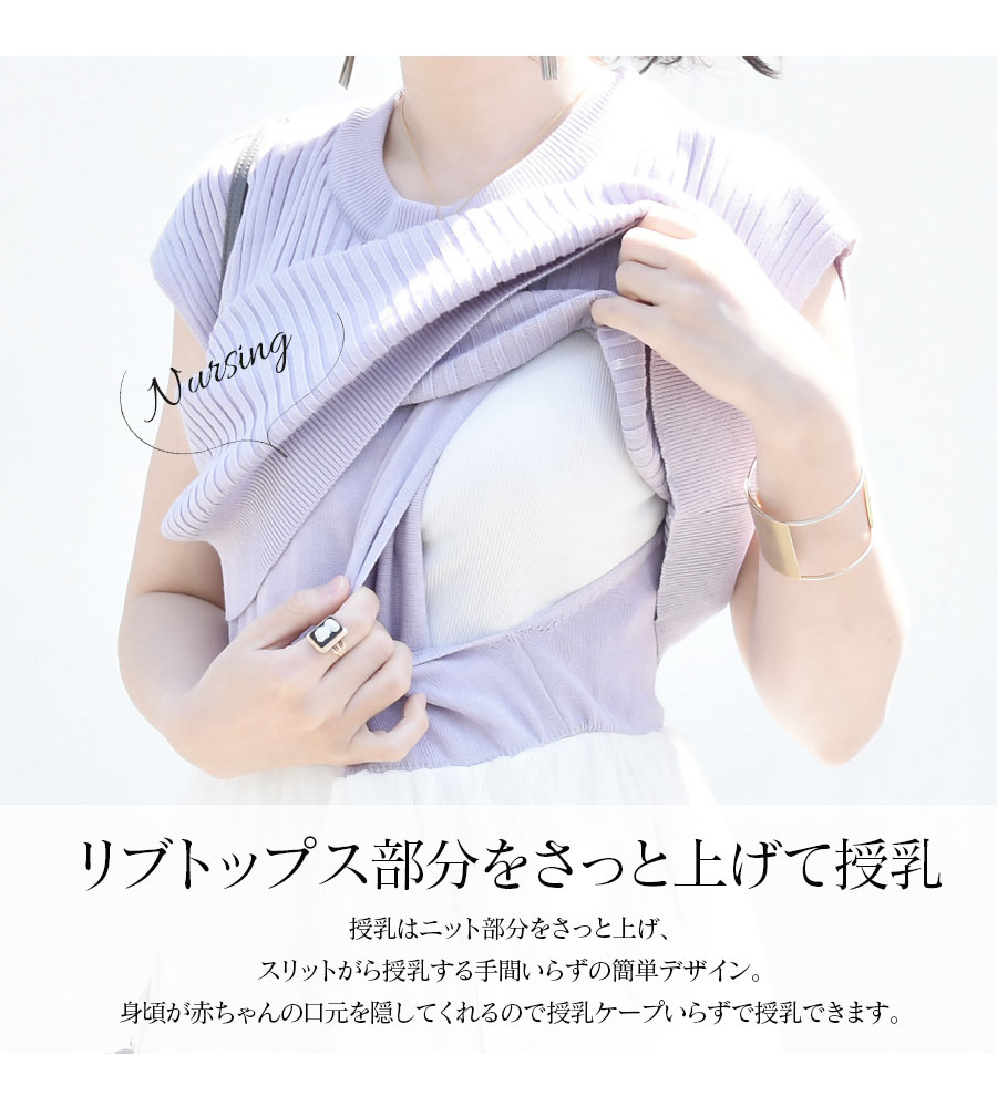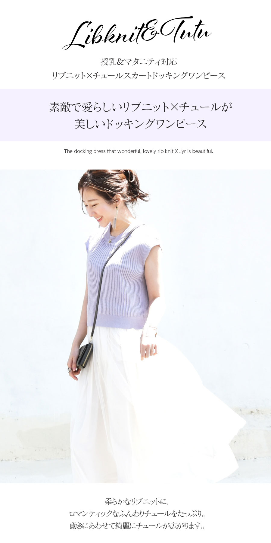 オトナ女子の素敵で愛らしいリブニット×チュールが美しいドッキングワンピースです。 一枚でさっと着るだけで重ね着コーデが完成する、ワンピースは忙しいママには嬉しいワンピース。 柔らかなリブニットに、ロマンティックなふんわりチュールをたっぷり。動きにあわせて綺麗にチュールが広がります。 人気のくすみラベンダーと、ホワイト&ブラックを使って、デザインの甘さを大人っぽく仕上げてあります。 もちろん大きなお腹で着ること考えてデザインしているので、お腹も楽ちん、体系を問わずいつでもキレイに着られるのも嬉しいポイント。 授乳はニット部分をさっと上げ、スリットがら授乳する手間いらずの簡単デザイン。見頃が赤ちゃんの口元を隠してくれるので、抱っこしているみたいに自然な授乳が叶います。 授乳ケープいらずで授乳でき、見た目は授乳服に見えないので、妊娠初期〜産後の授乳期、その先までずっと着られます。
