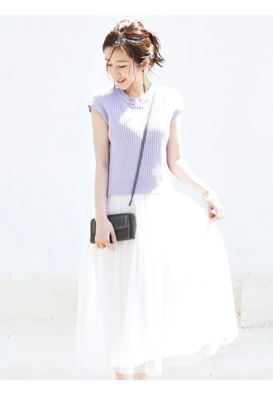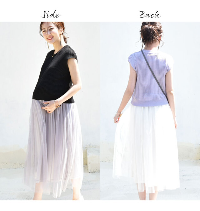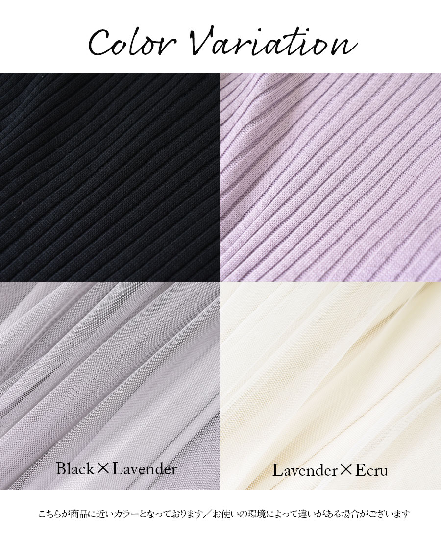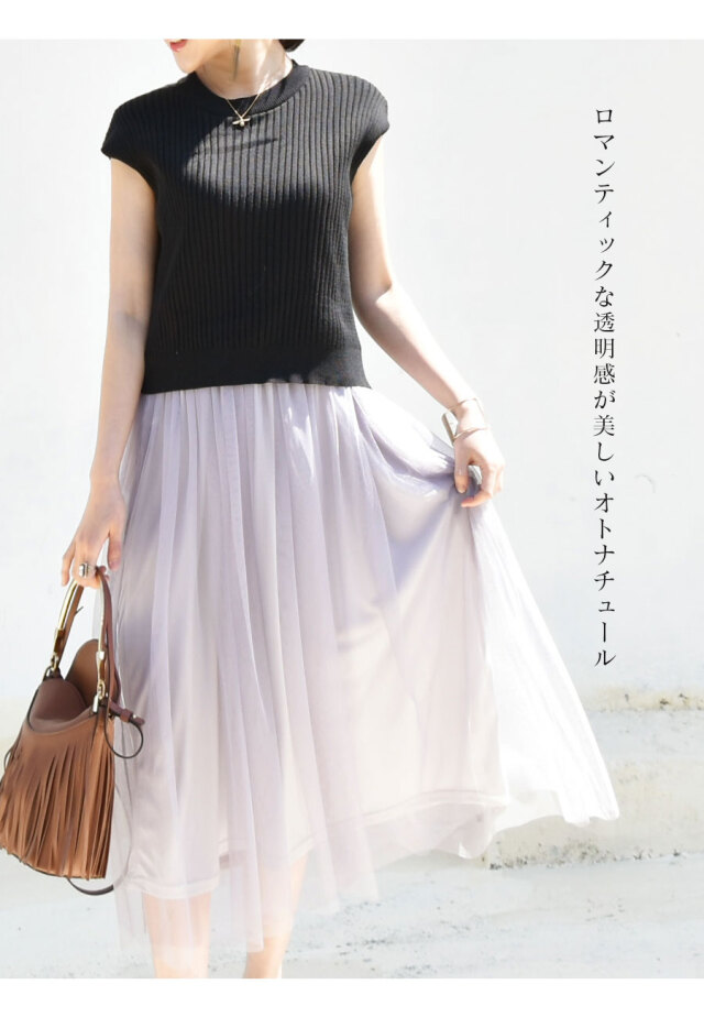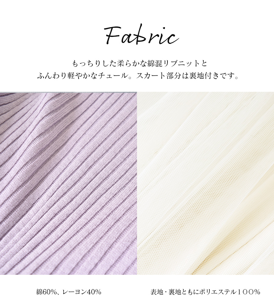 柔らかなリブニットに、ロマンティックなふんわりチュールをたっぷり。動きにあわせて綺麗にチュールが広がります。