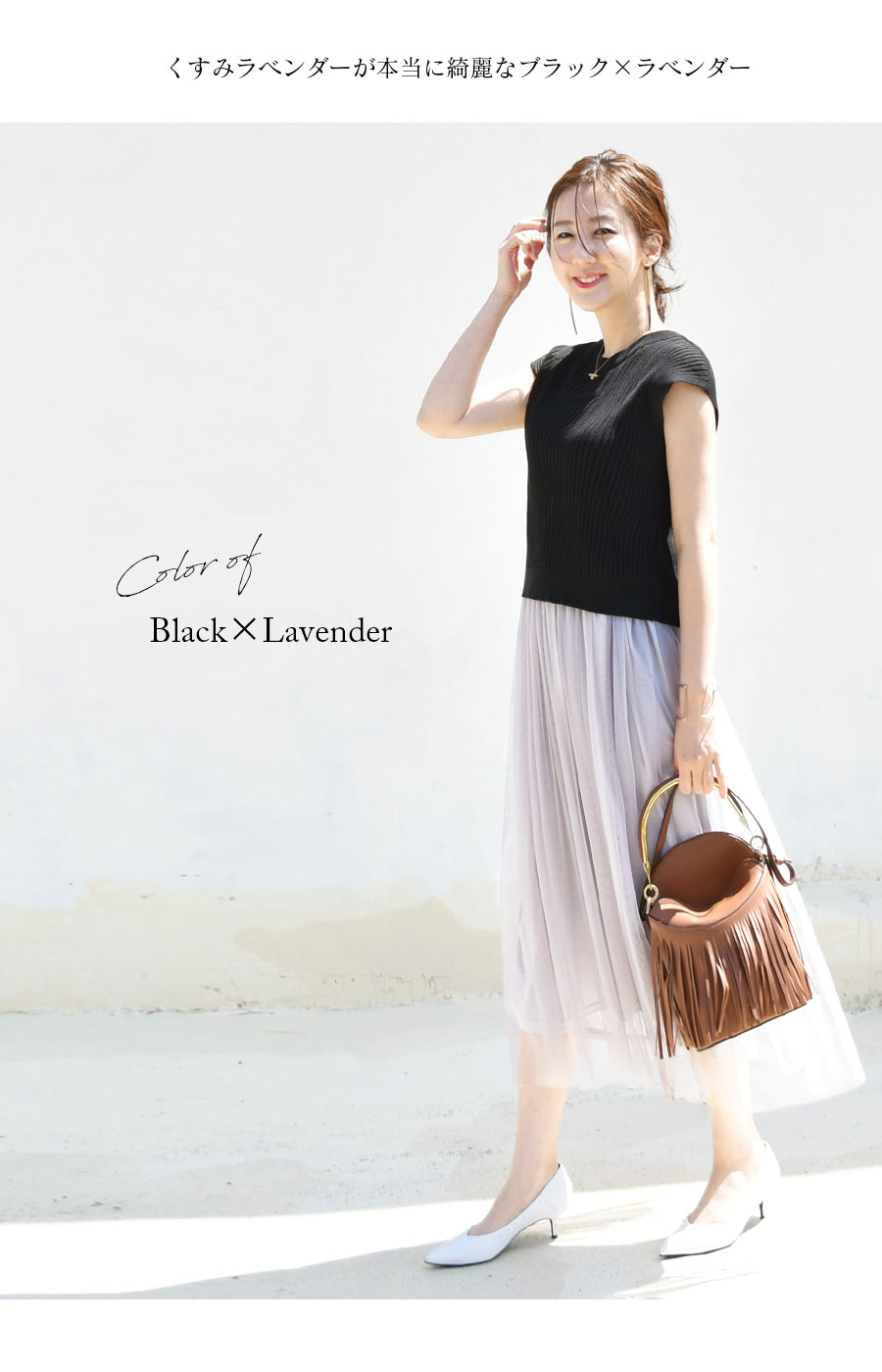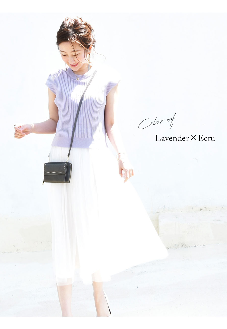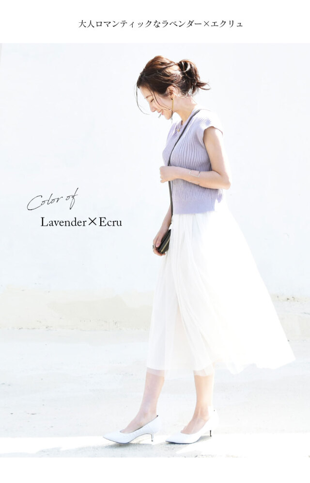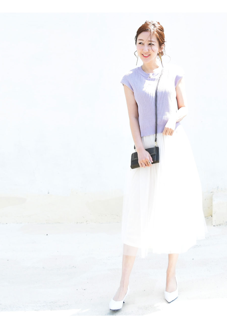 柔らかなリブニットに、ロマンティックなふんわりチュールをたっぷり。動きにあわせて綺麗にチュールが広がります。