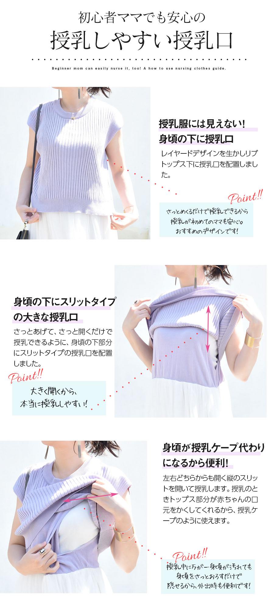 授乳はニット部分をさっと上げ、スリットがら授乳する手間いらずの簡単デザイン。見頃が赤ちゃんの口元を隠してくれるので、抱っこしているみたいに自然な授乳が叶います。