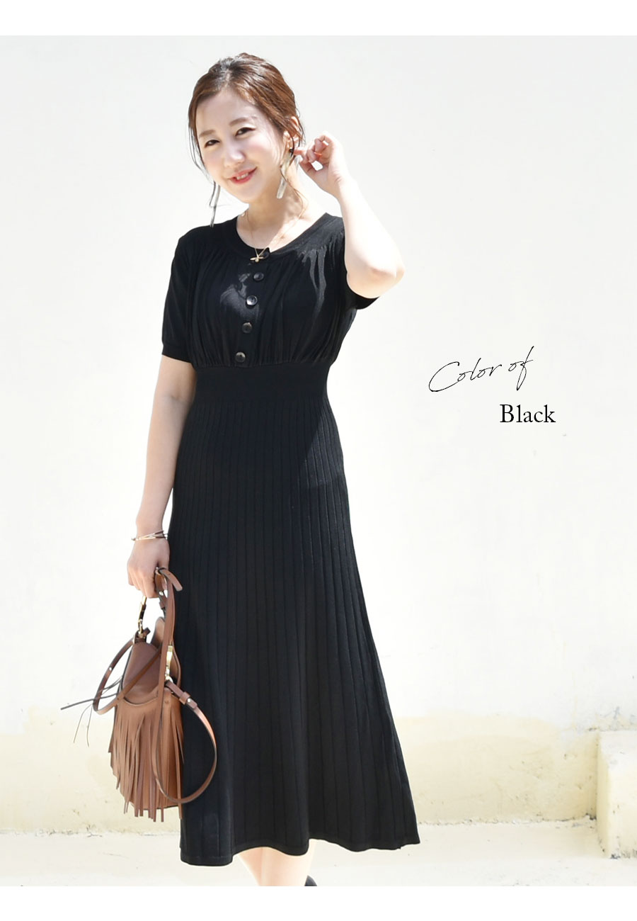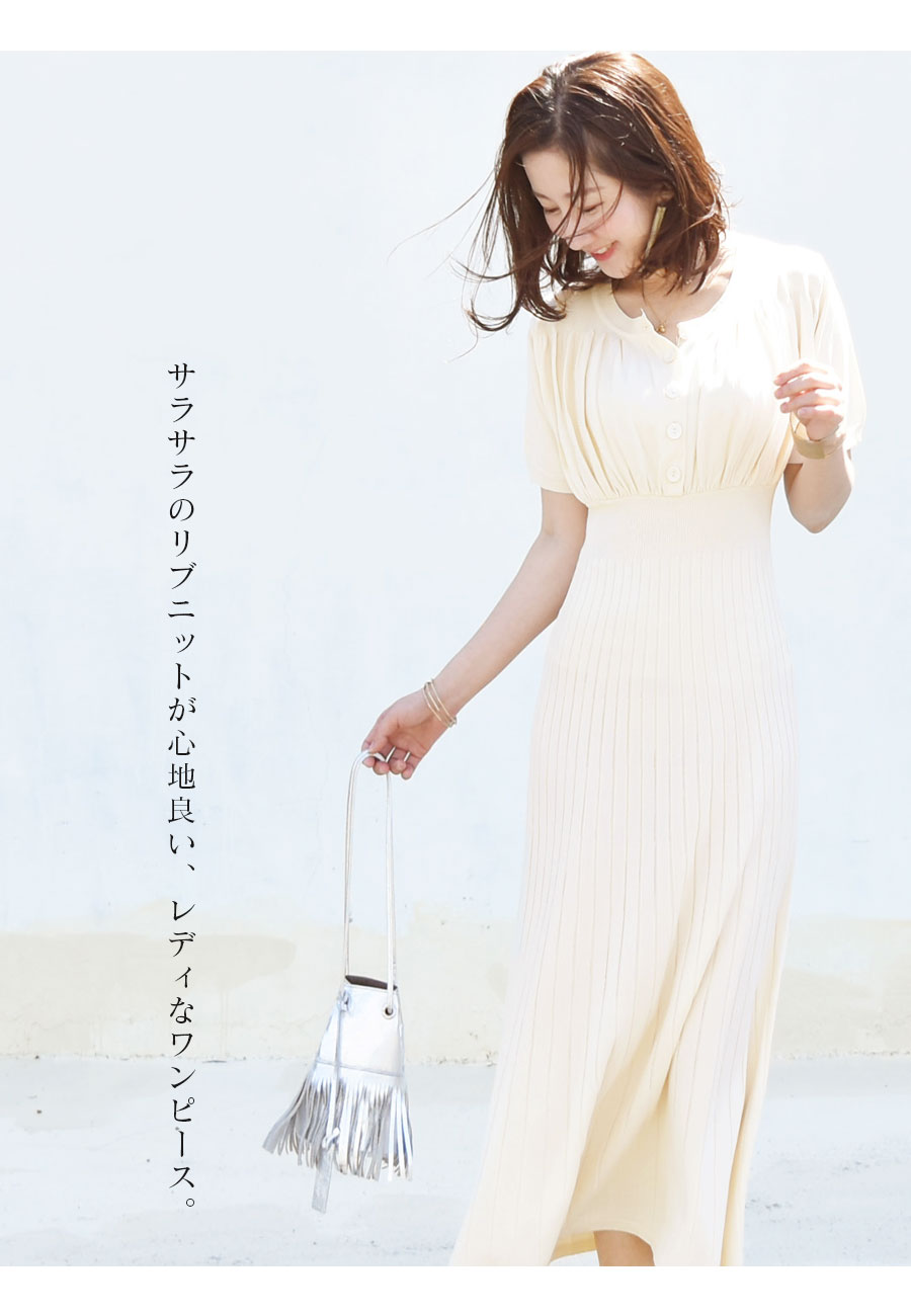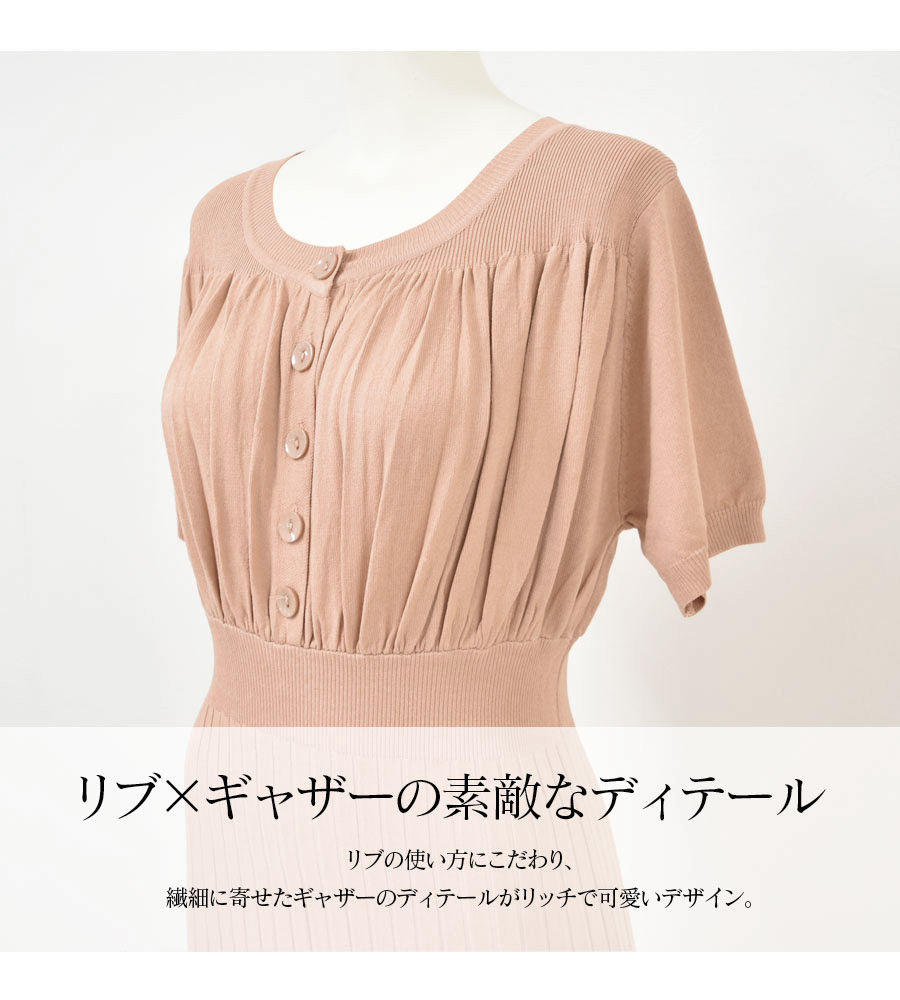 伸びの良い暑い季節にもべたつかないサラサラニットで、トップス部分はギャザーを入れ、ころんとしたボタンを並べてふんわり可愛い雰囲気に。
