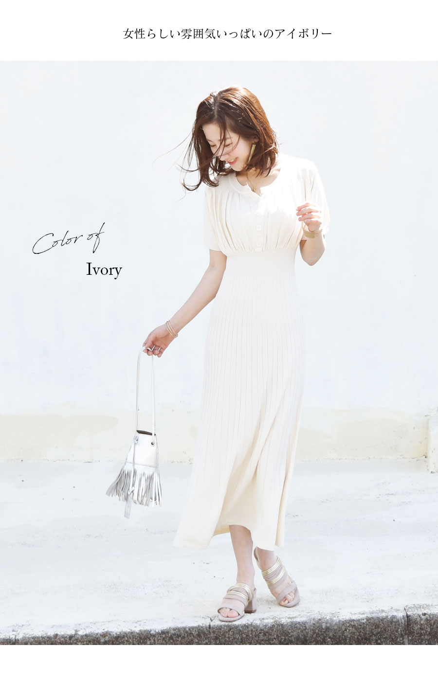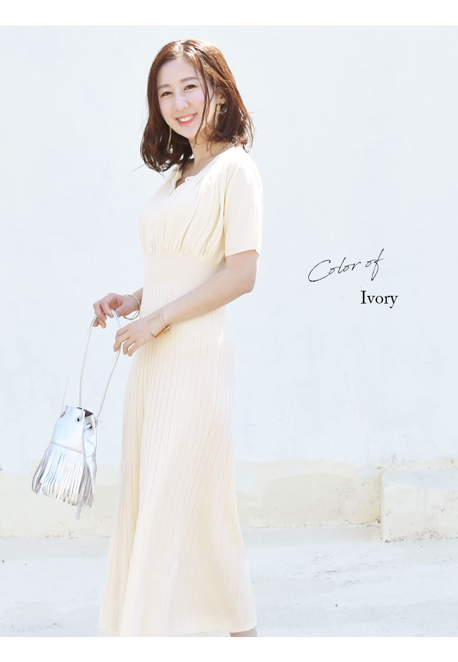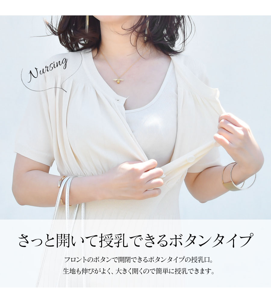 ふんわりパフィーなギャザーとリブニットで作る、華奢見えする美しいシルエット。レーヨン混のサラサラニット素材が心地よい、大人可愛い授乳&マタニティワンピースです。 伸びの良い暑い季節にもべたつかないサラサラニットで、トップス部分はギャザーを入れ、ころんとしたボタンを並べてふんわり可愛い雰囲気に。 胸下からのハイウエスト部分にはリブを使い、楽ちんな着心地なのにウエストをキュっと細くみせてくれます。 また、ウエスト〜リブの入ったフレアースカートへのメリハリある美しいラインが、びっくりするくらい華奢見えするシルエットを作ってくれます。 もちろんマタニティの大きなお腹にも優しくフィットしながら綺麗に着られるデザインです。 授乳口はさっと外すだけのボタンタイプ。閉じてしまえば授乳服にはまったく見えないので、産前産後はもちろん、卒乳後までお使いいただけます。 フォーマルな雰囲気もあるきれいなデザインなので、お宮参りやお食い初めなどきちんとした日にもお使いいただけます。
