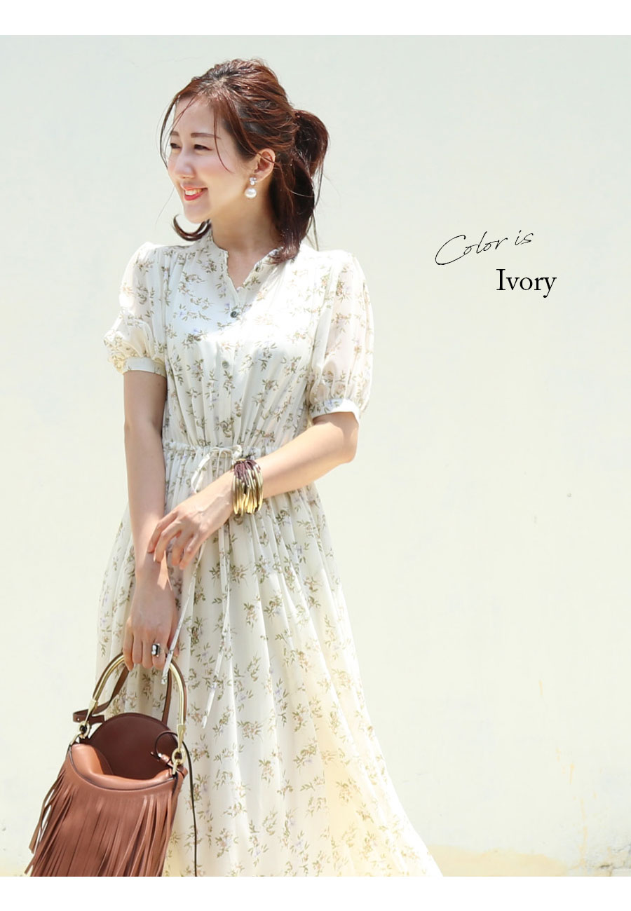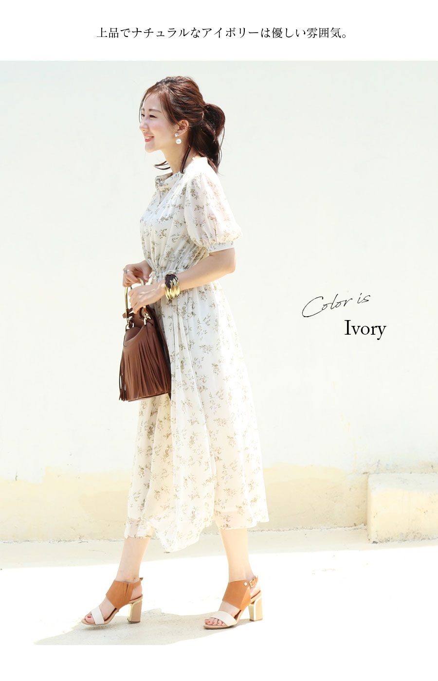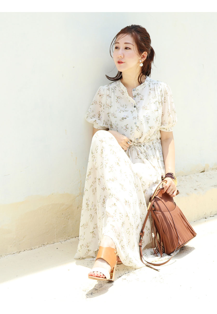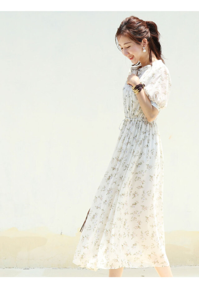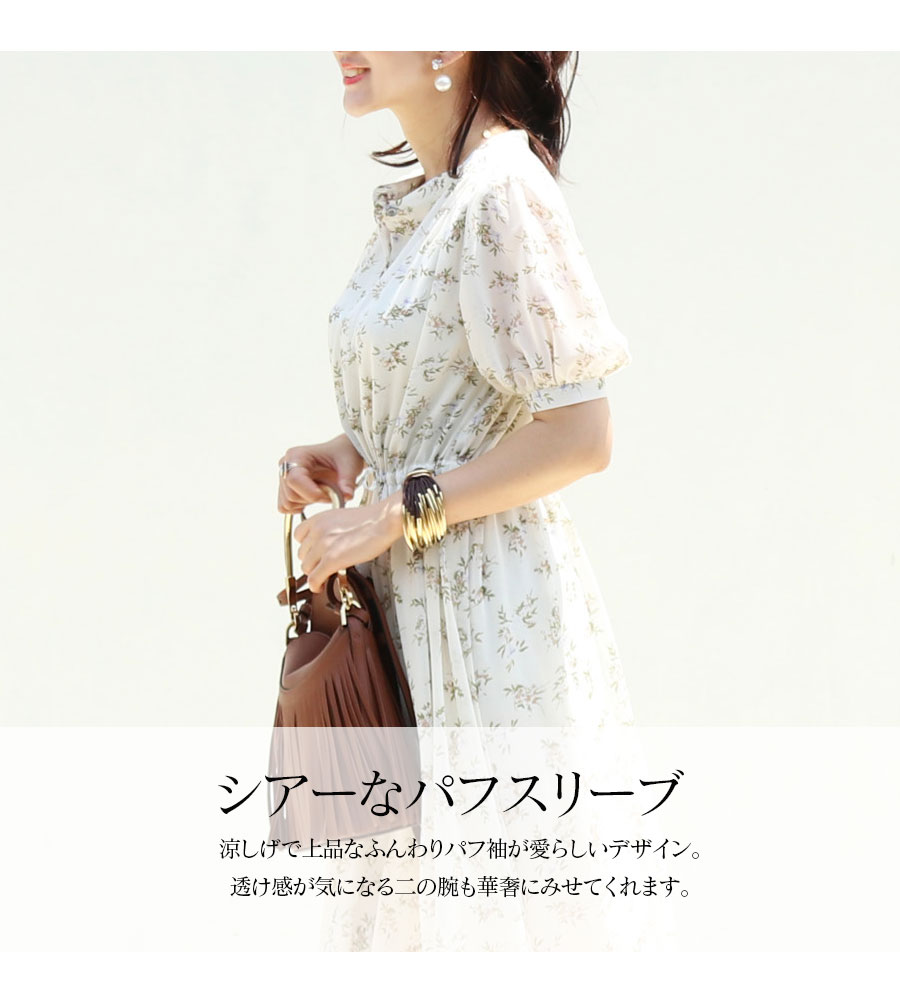 涼しげ&透け感あるパフィーな袖と、やわらかく広がるスカートのシルエットが上品な佇まい。