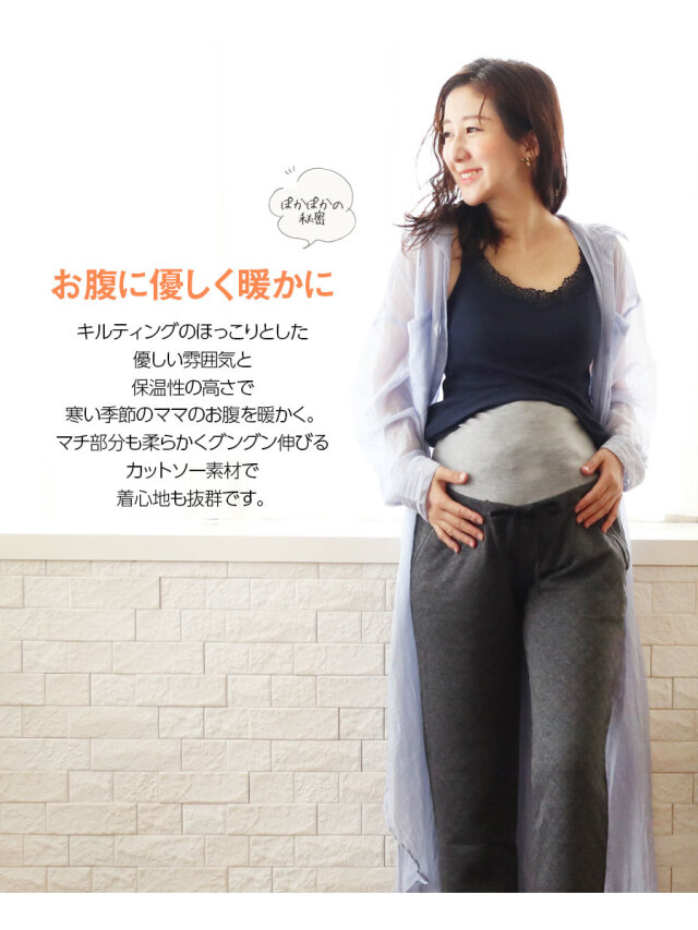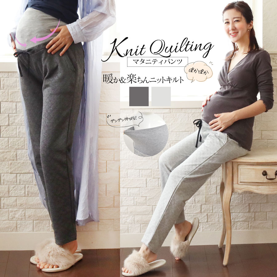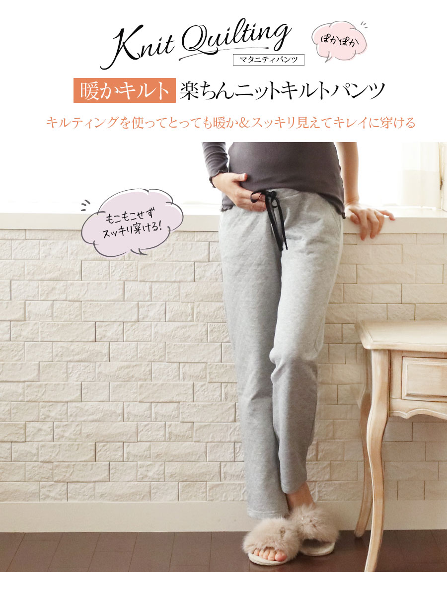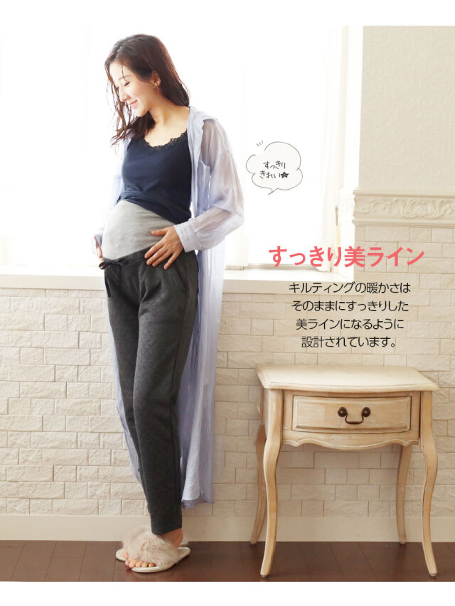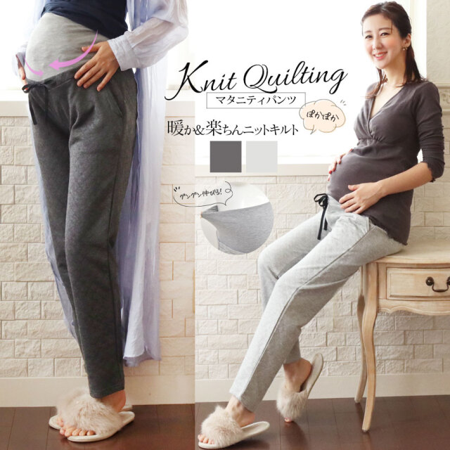 寒い季節のママのお腹を暖かく快適にする、ニットキルト素材のマタニティパンツです。
