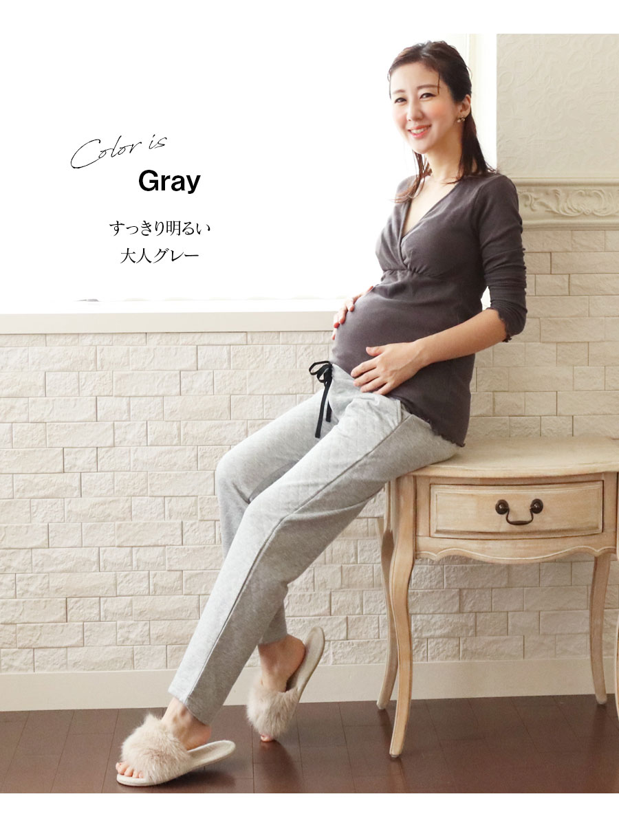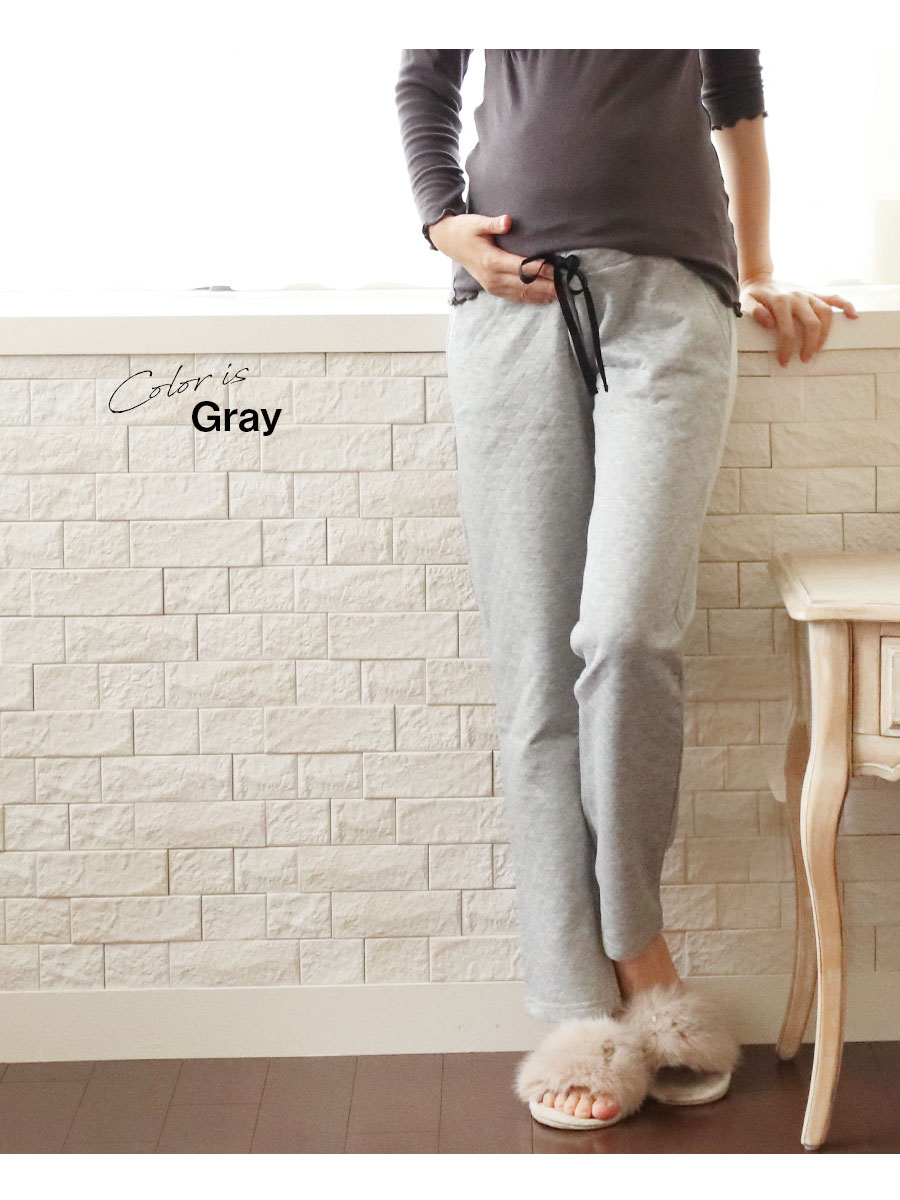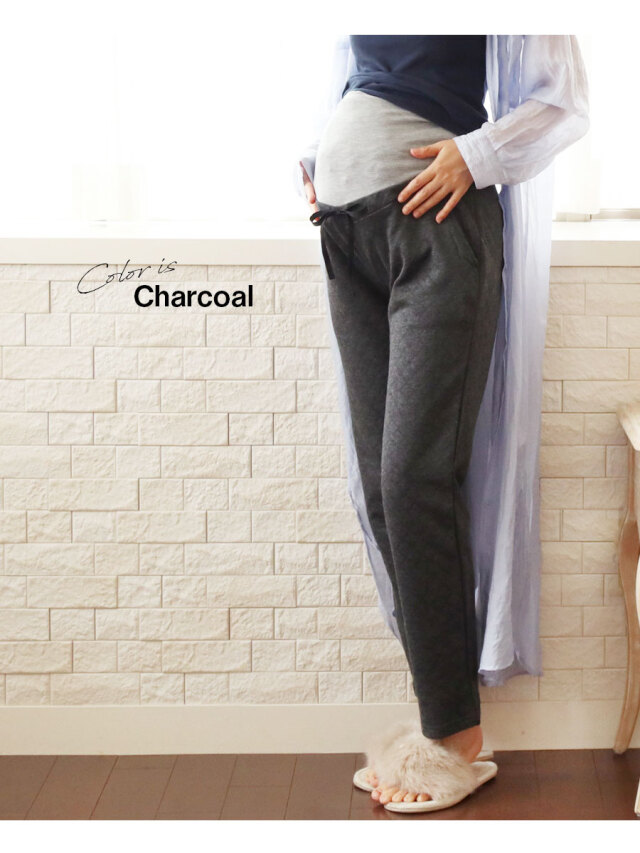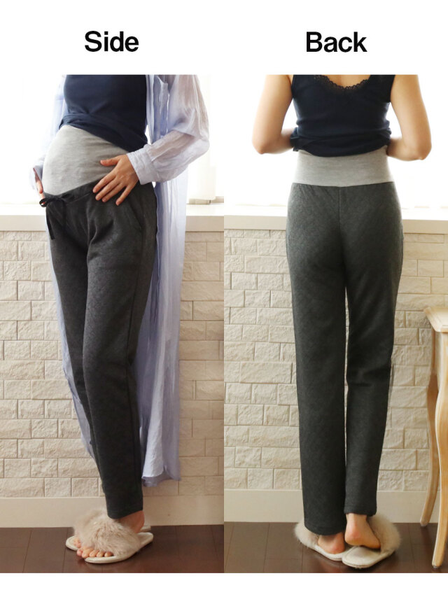 寒い季節のママのお腹を暖かく快適にする、ニットキルト素材のマタニティパンツです。
