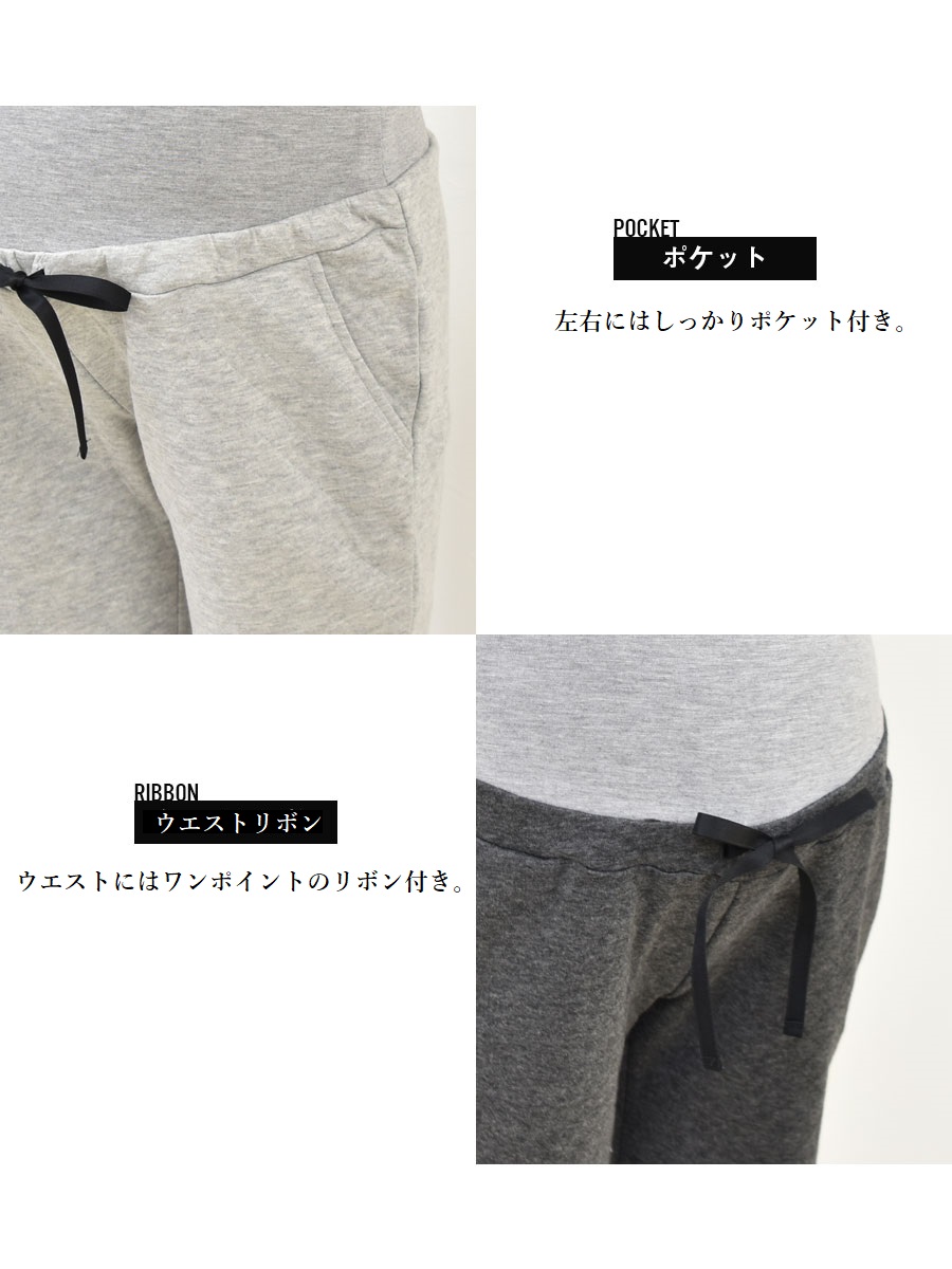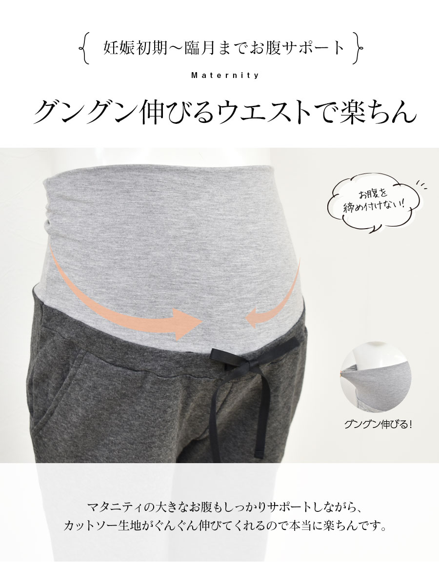 お腹部分はグングン伸びるカットソー素材を使用し、大きなお腹を楽ちん&しっかりサポート。ウエストにはワンポイントのリボンがついています。
