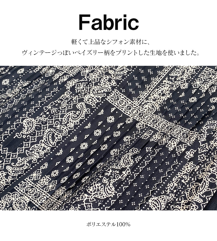 軽くて上品なシフォン素材に、ヴィンテージっぽいペイズリー柄をプリントした生地を使い、スカート部分を繊細なプリーツで仕上げたシンプルだけど綺麗なデザイン。