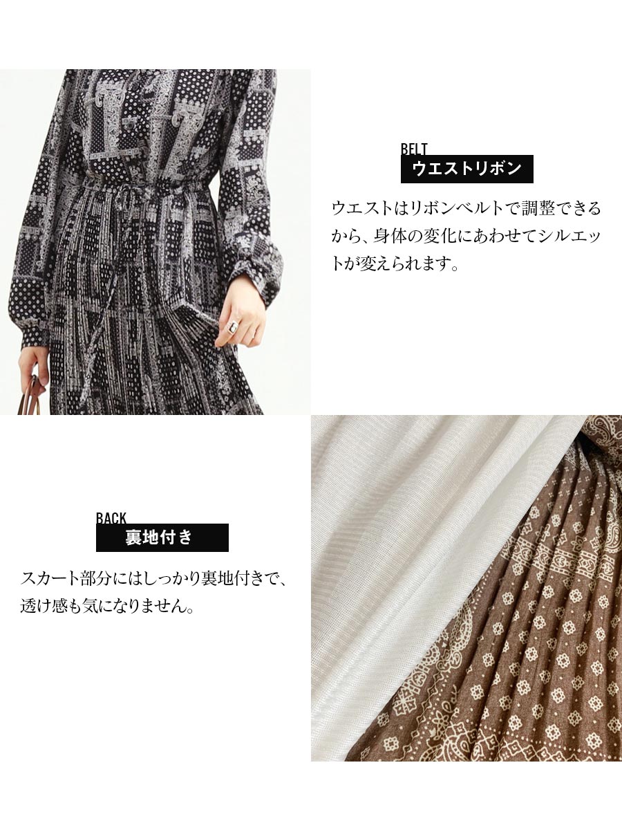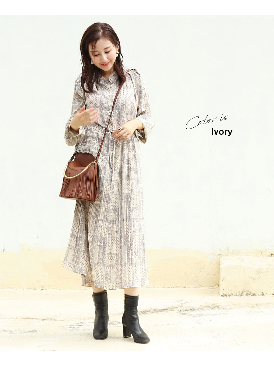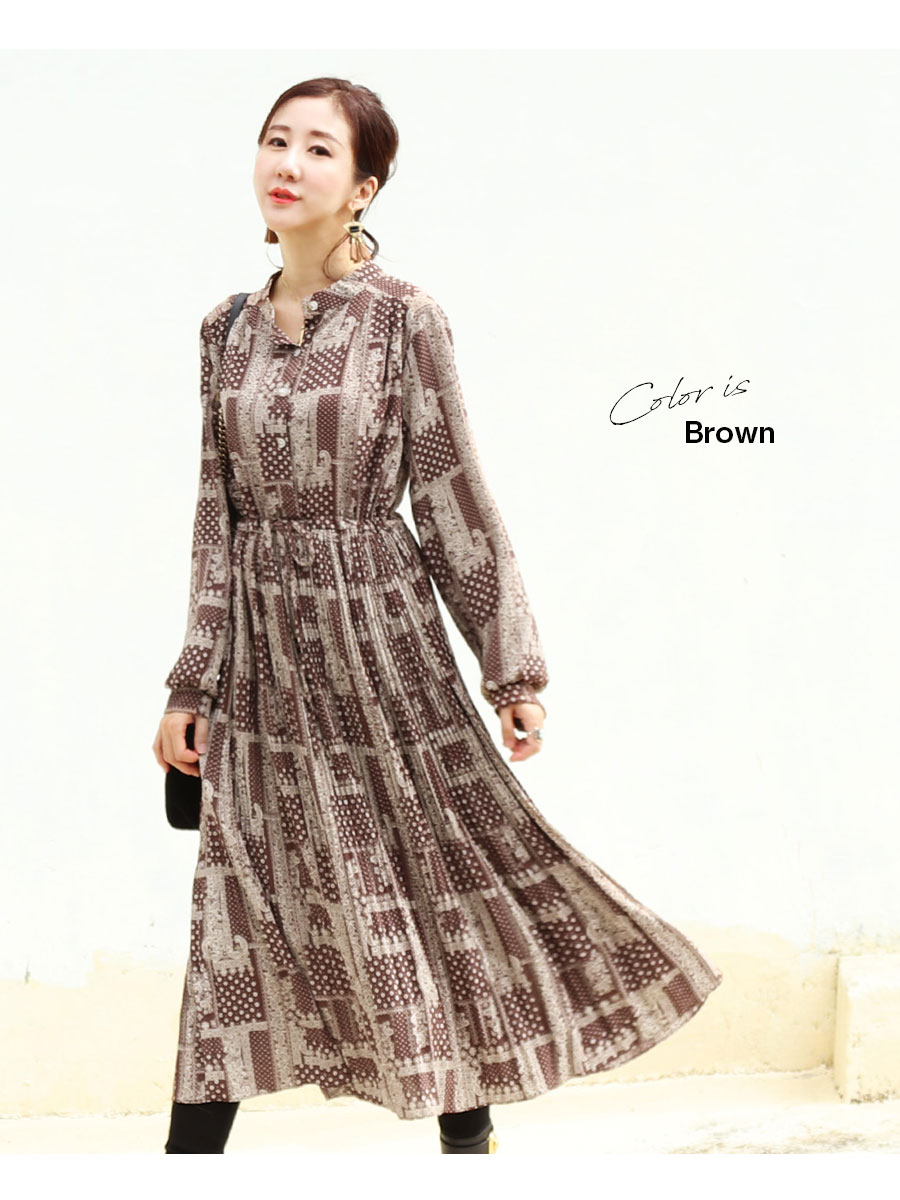 すこしレトロなカラーとペイズリー柄が印象的。流れるように繊細なプリーツがサラサラ広がる、大人ロマンティックなワンピースです。