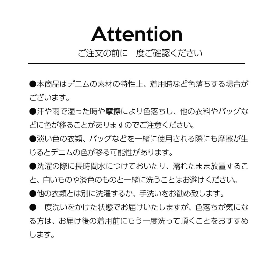 ●本商品はデニムの素材の特性上、着用時など色落ちする場合がございます。