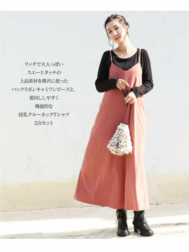 リッチで大人っぽいスエードタッチの上品素材を贅沢に使ったバックリボンキャミワンピースと、着回ししやすく機能的な授乳クルーネックTシャツの2点セットです。