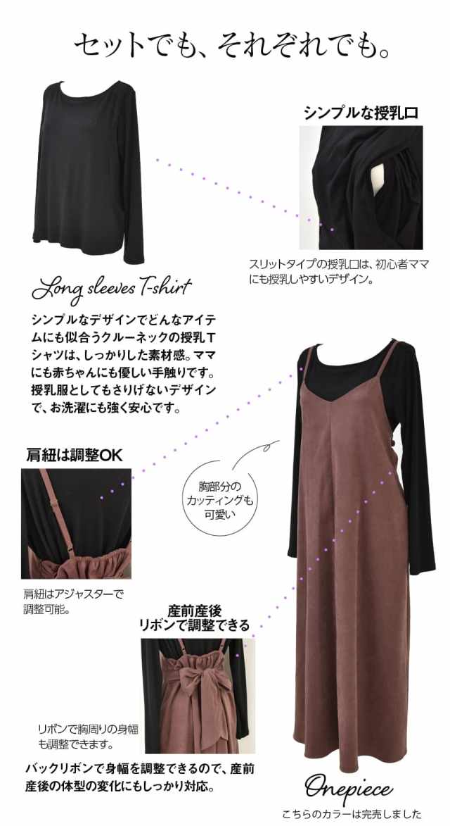 授乳服 授乳 マタニティ服 マタニティ 妊婦服 妊婦 妊娠 出産 産前産後 授乳期 妊娠初期 妊娠中期 妊娠後期 ワンピース ワンピ キャミワンピース キャミワンピ バックリボン リボン スエード素材 スエードタッチ ロング ロング丈 授乳Tシャツ 授乳トップス Tシャツ TEE クルーネック シンプル 長袖 スリットタイプ 授乳口 綿混 長袖 コーデセット コーデ2点セット ウエスト調整可能 春 秋 冬 Milk tea ミルクティー ミルクティ