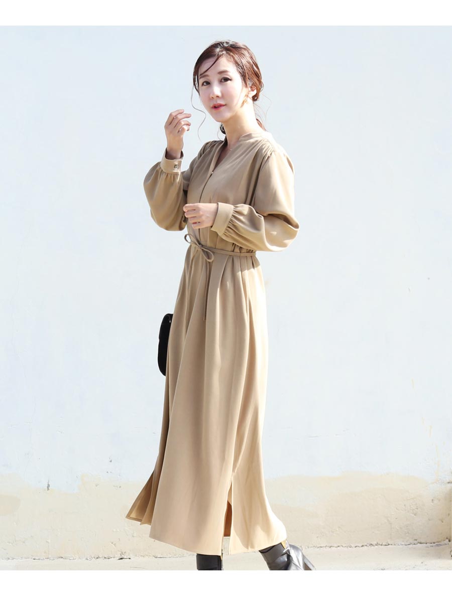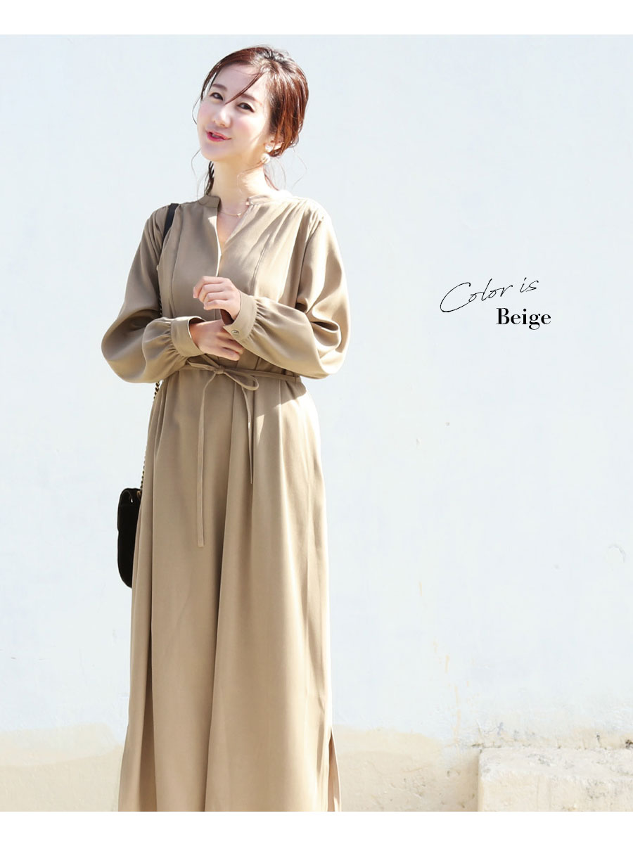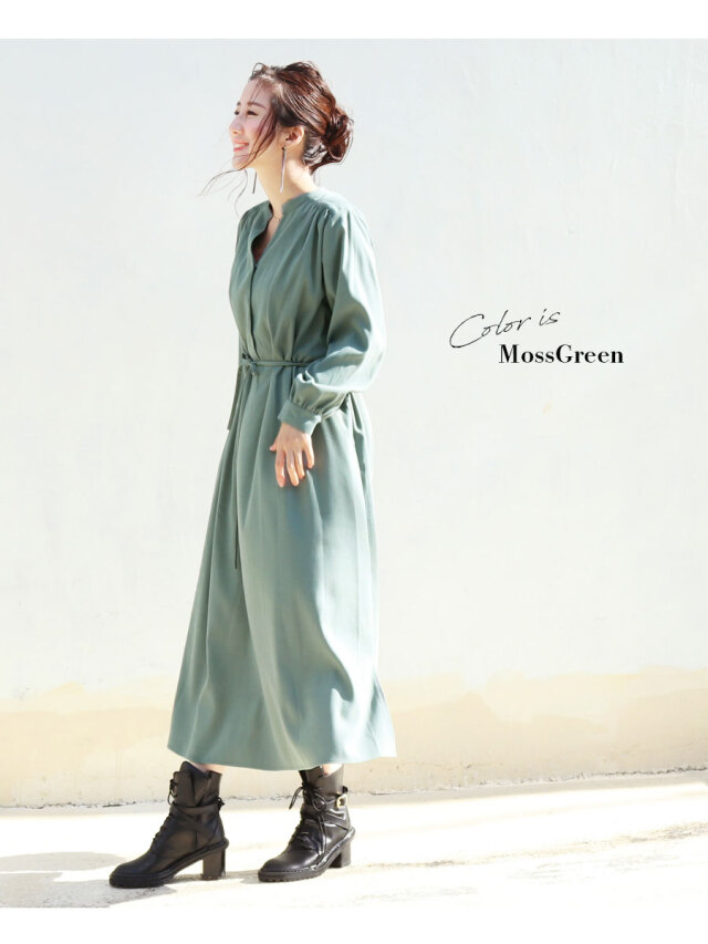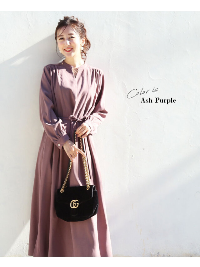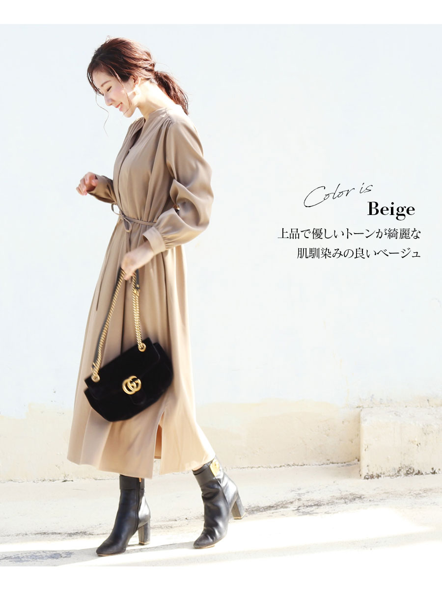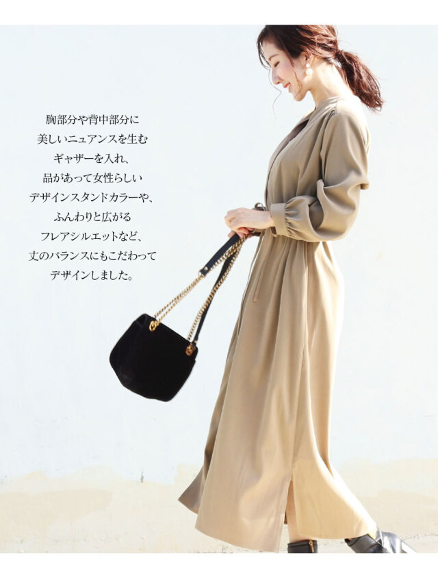 胸部分や背中部分に美しいニュアンスを生むギャザーを入れ、品があって女性らしいデザインスタンドカラーや、ふんわりと広がるフレアシルエットなど、丈のバランスにもこだわってデザインしました。