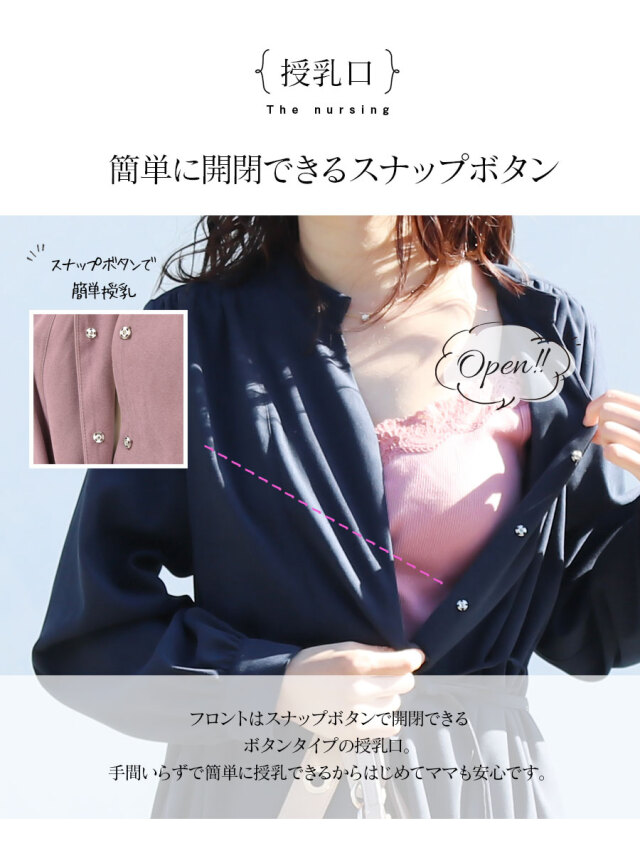 授乳はさっと外すだけのスナップボタンタイプの授乳口。手間いらずで授乳できるので、授乳初めてママも安心。
