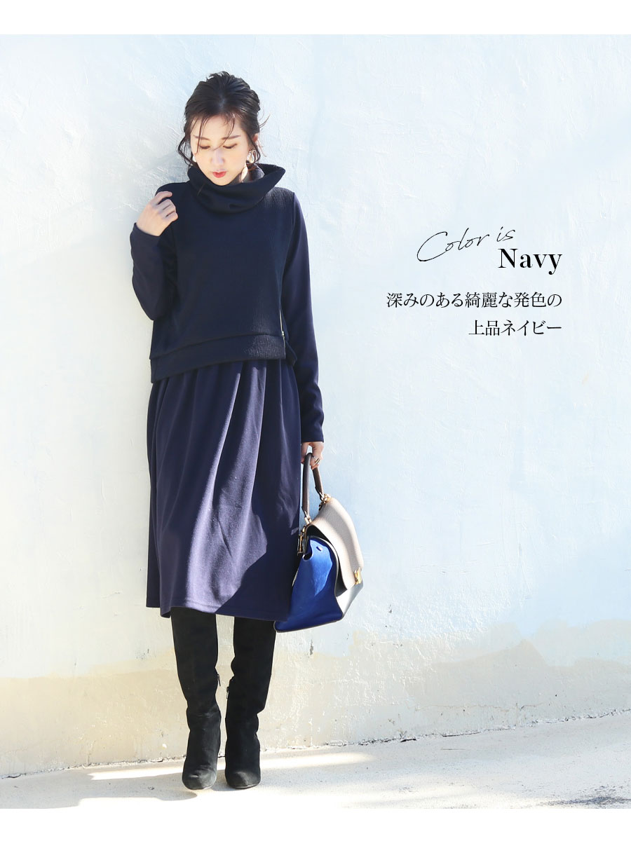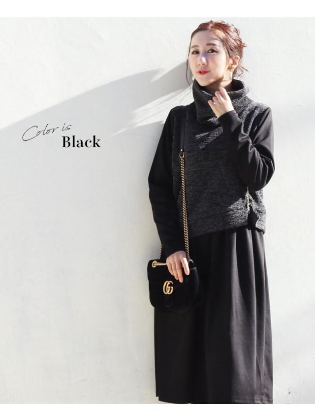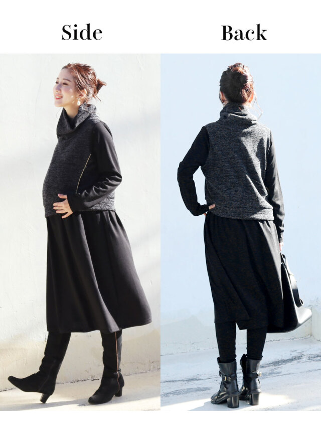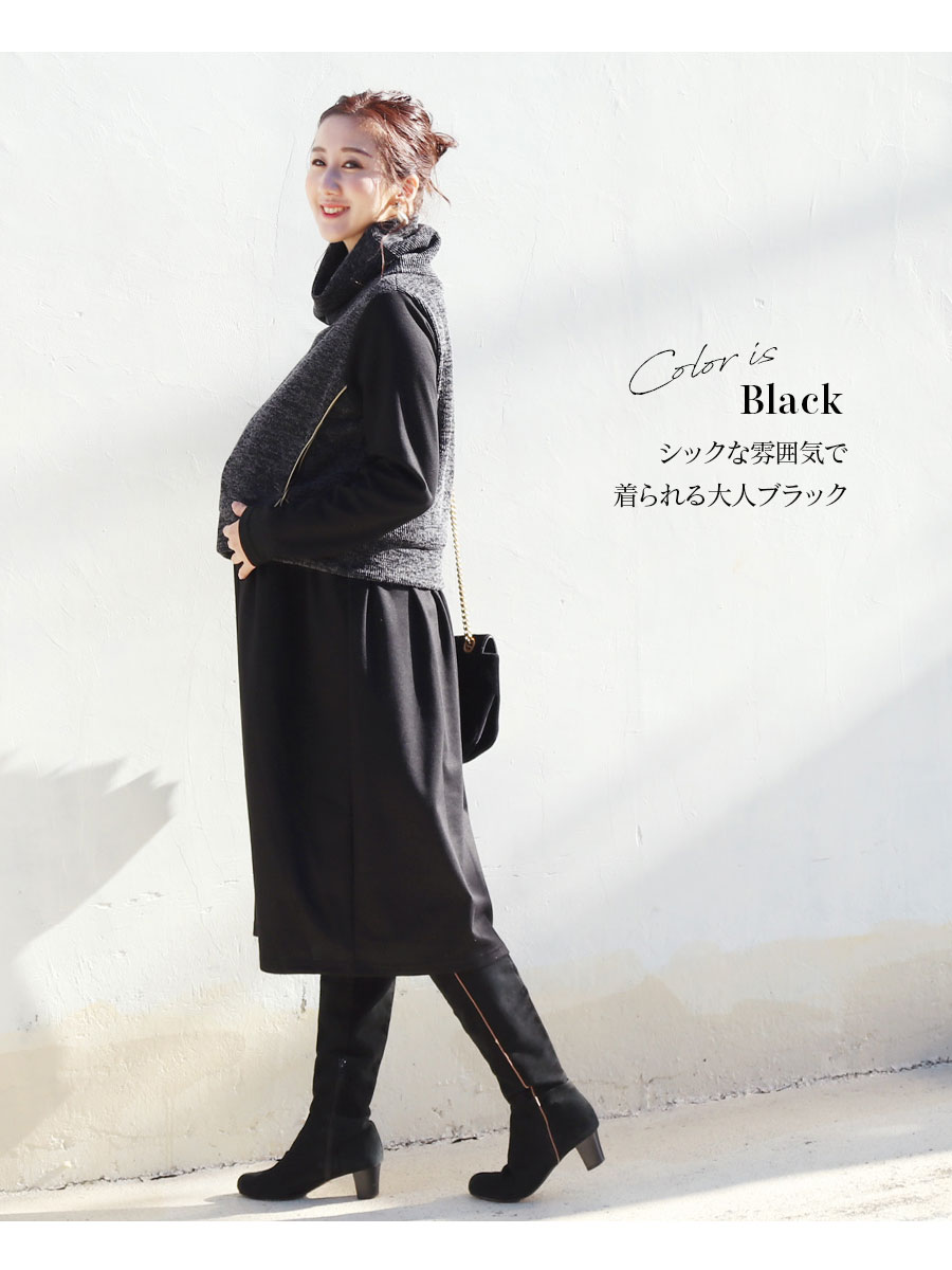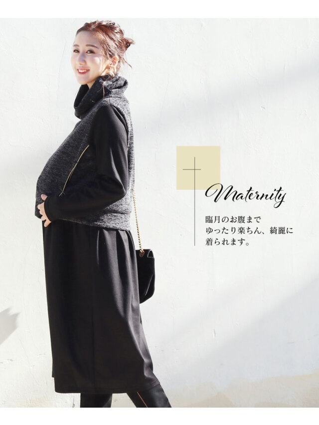 柔らかく上質な光沢のジャージー素材ワンピースに、ニットベストを重ね着したようなおしゃれなデザインの授乳服&マタニティワンピース。