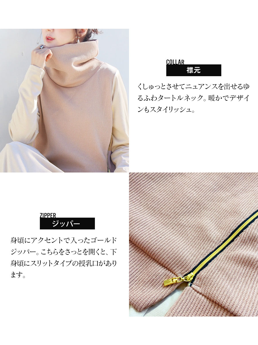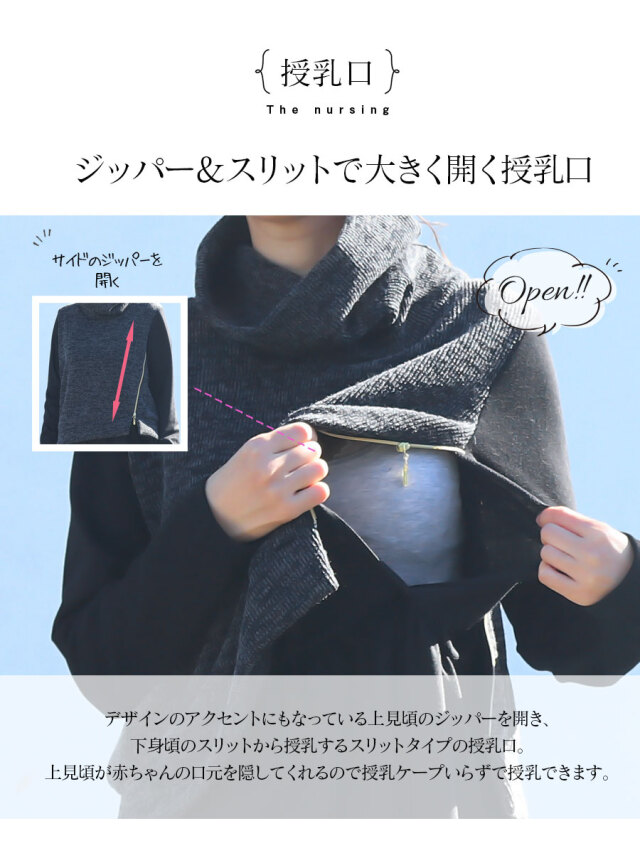 授乳は上見頃のゴールドジッパーを開き、下身頃のスリットからさっと授乳できます。身頃が授乳ケープがわりの目隠しにもなってくれるので、お出かけの際も授乳ケープいらずで授乳でき安心です。