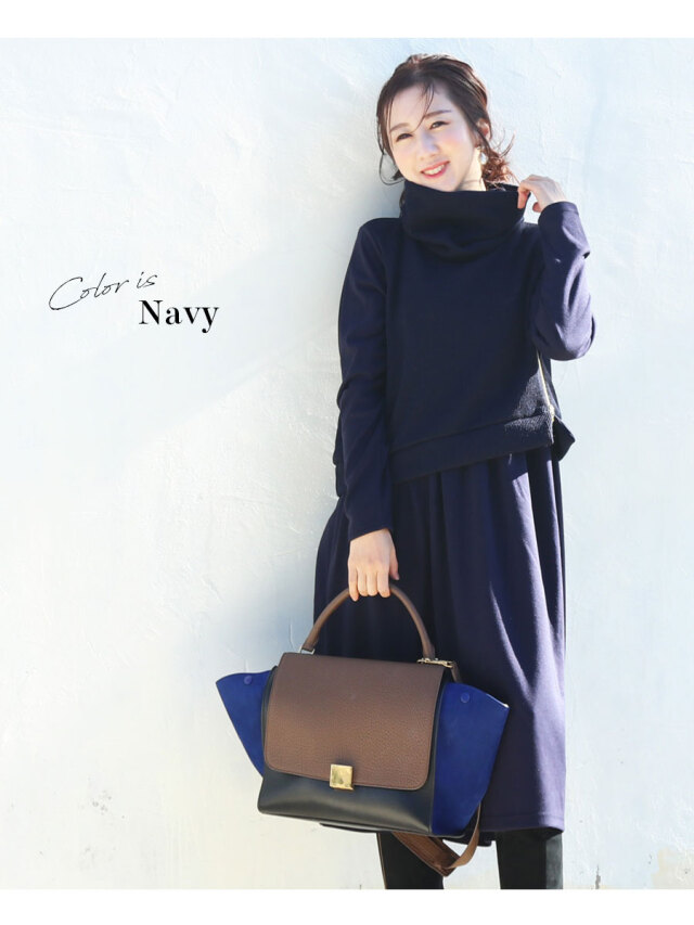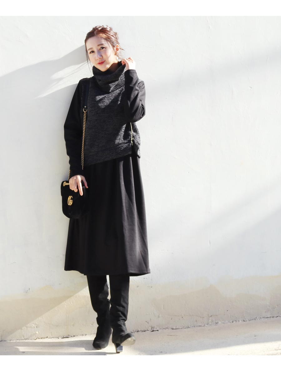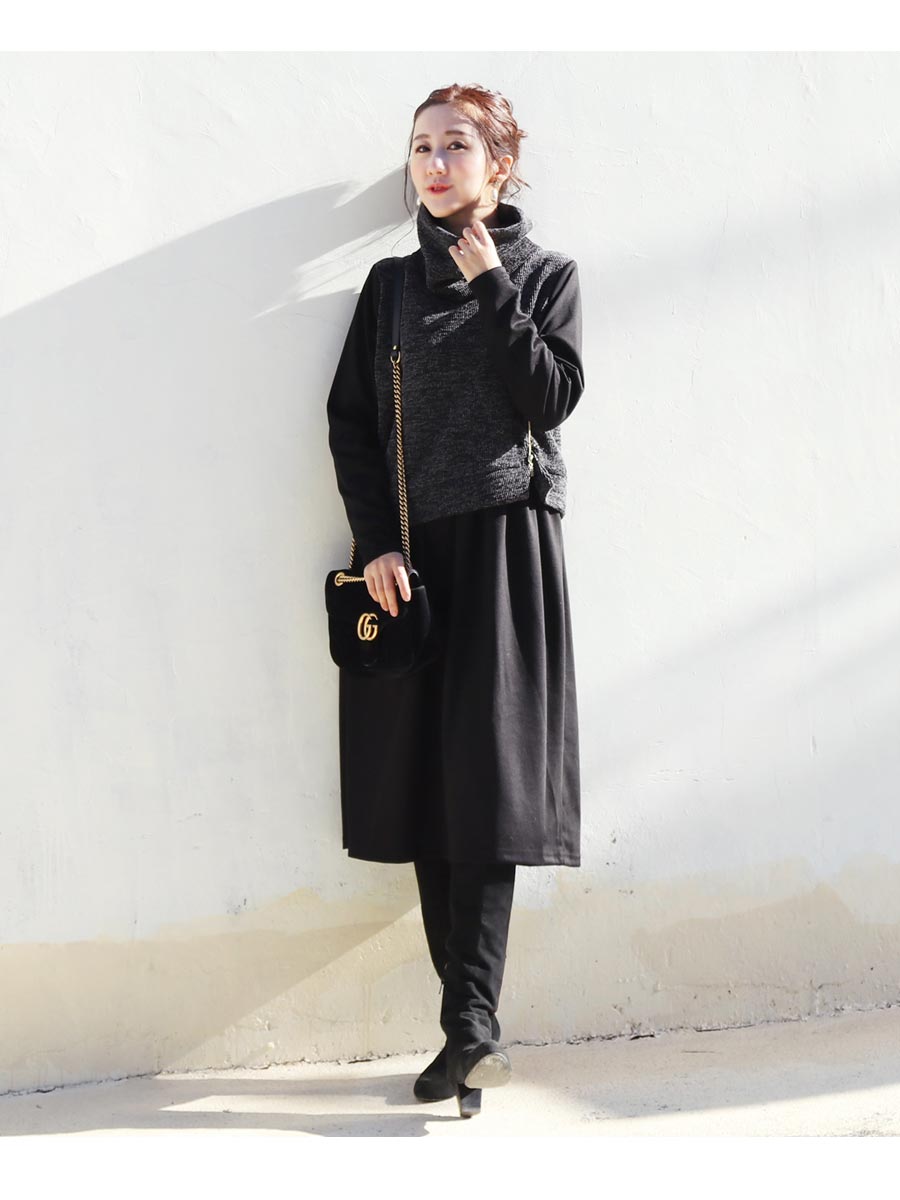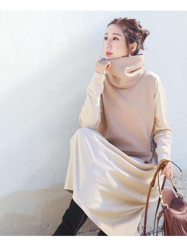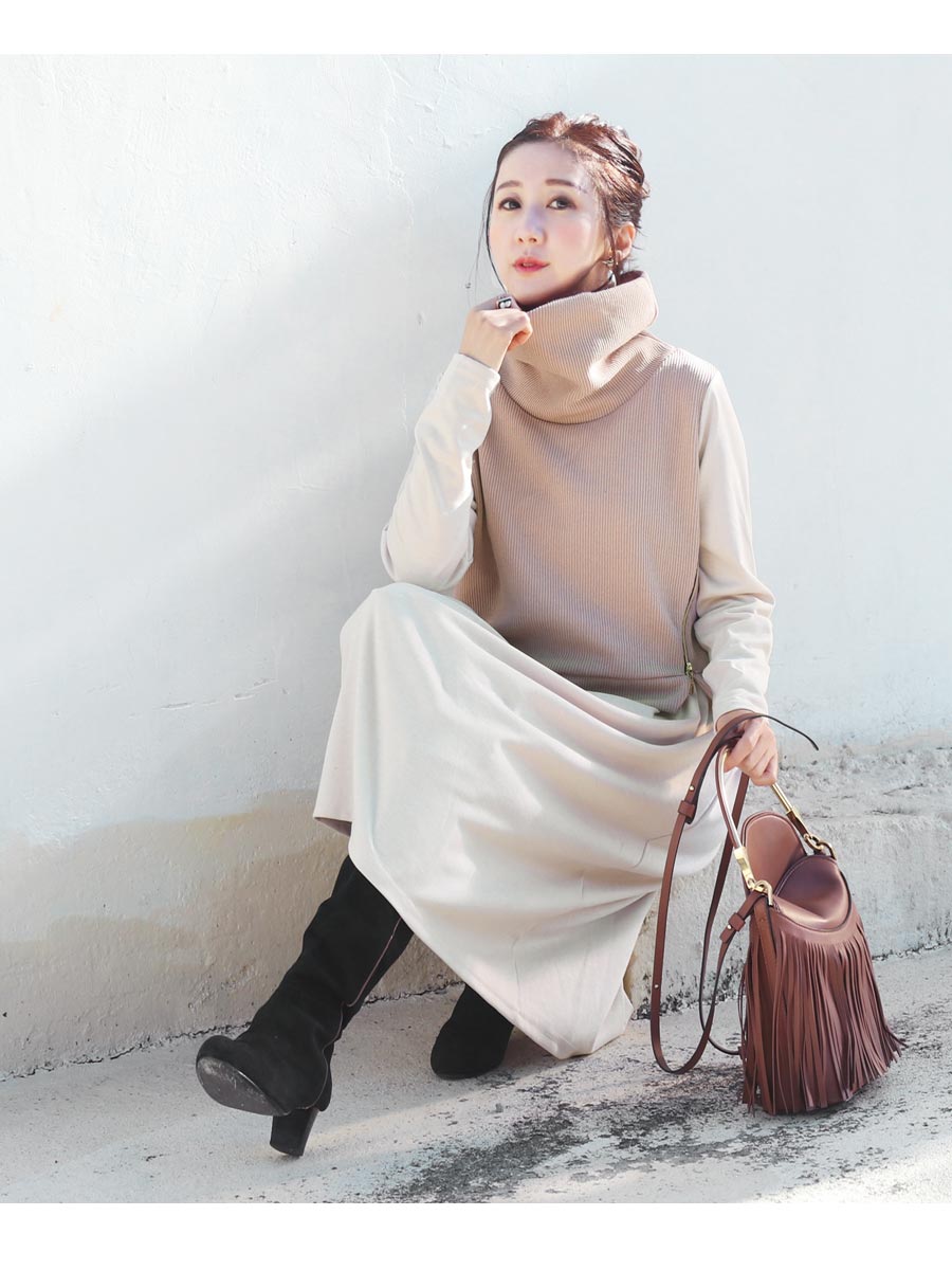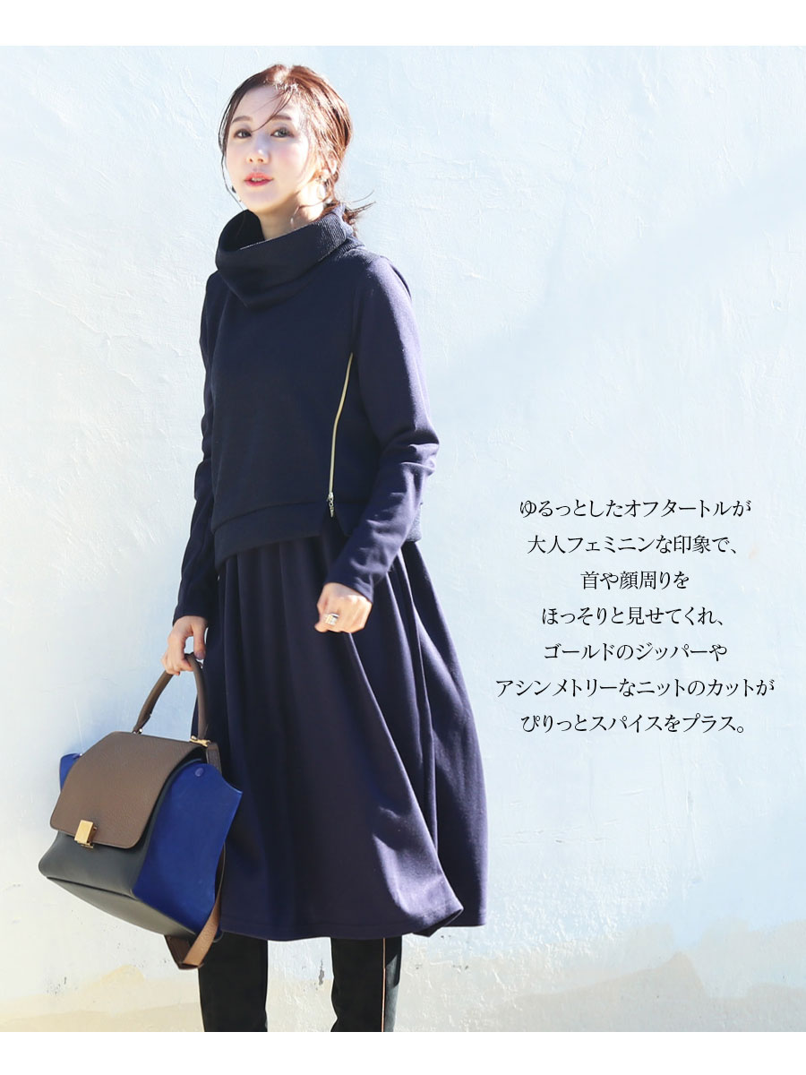 ゆるっとしたオフタートルが大人フェミニンな印象で、首や顔周りをほっそりと見せてくれ、ゴールドのジッパーやアシンメトリーなニットのカットがぴりっとスパイスをプラス。