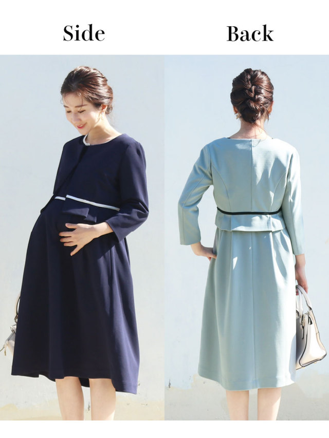 ストレッチするリッチな質感のフォーマル素材を使い着心地も抜群。産前産後、どの時期に着ても綺麗に着られるシルエットにこだわりました。