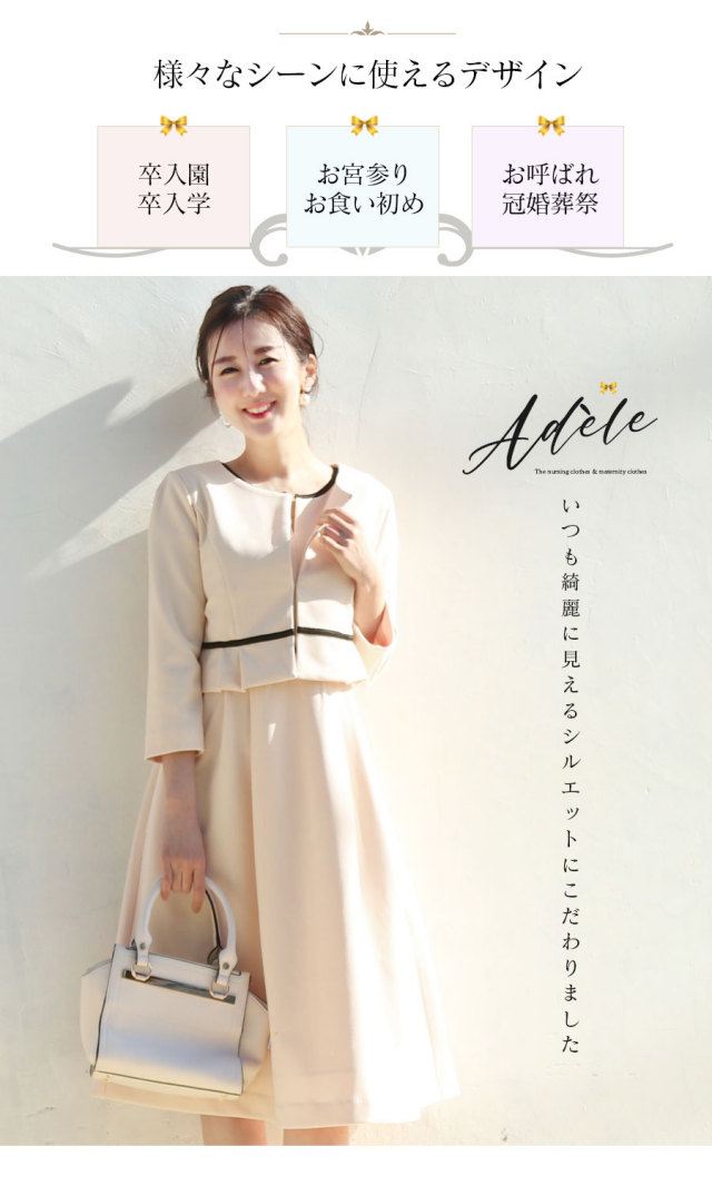 ジャケット&ワンピースのセットでの着用ではもちろん、それぞれのアイテムでも使え、卒入園・卒入学などのイベントや、お宮参り、お食い初め、オフィスにと様々なシーンでお使いいただけます。